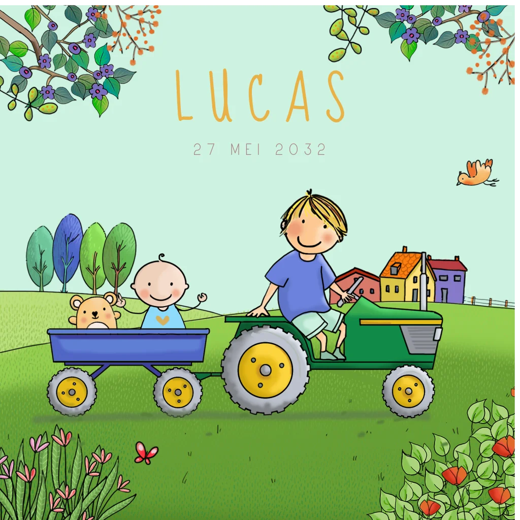 Raambord tractor met kar broertjes is een kleurrijk en vrolijk geboortekaartje met een retro voertuig thema. Het is perfect voor jongens of vogels die fan zijn van auto's of boerderijen.
