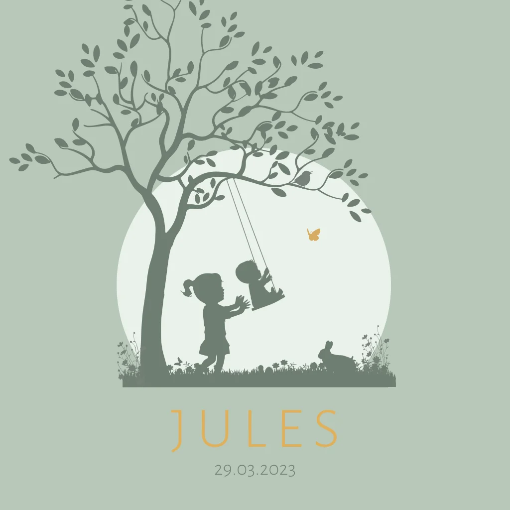 Deze raamsticker is afgeleid van het geboortekaartje jongen en zusje op schommel met boom en diertjes en is mooie geboorte aankondiging voor jouw kindje.