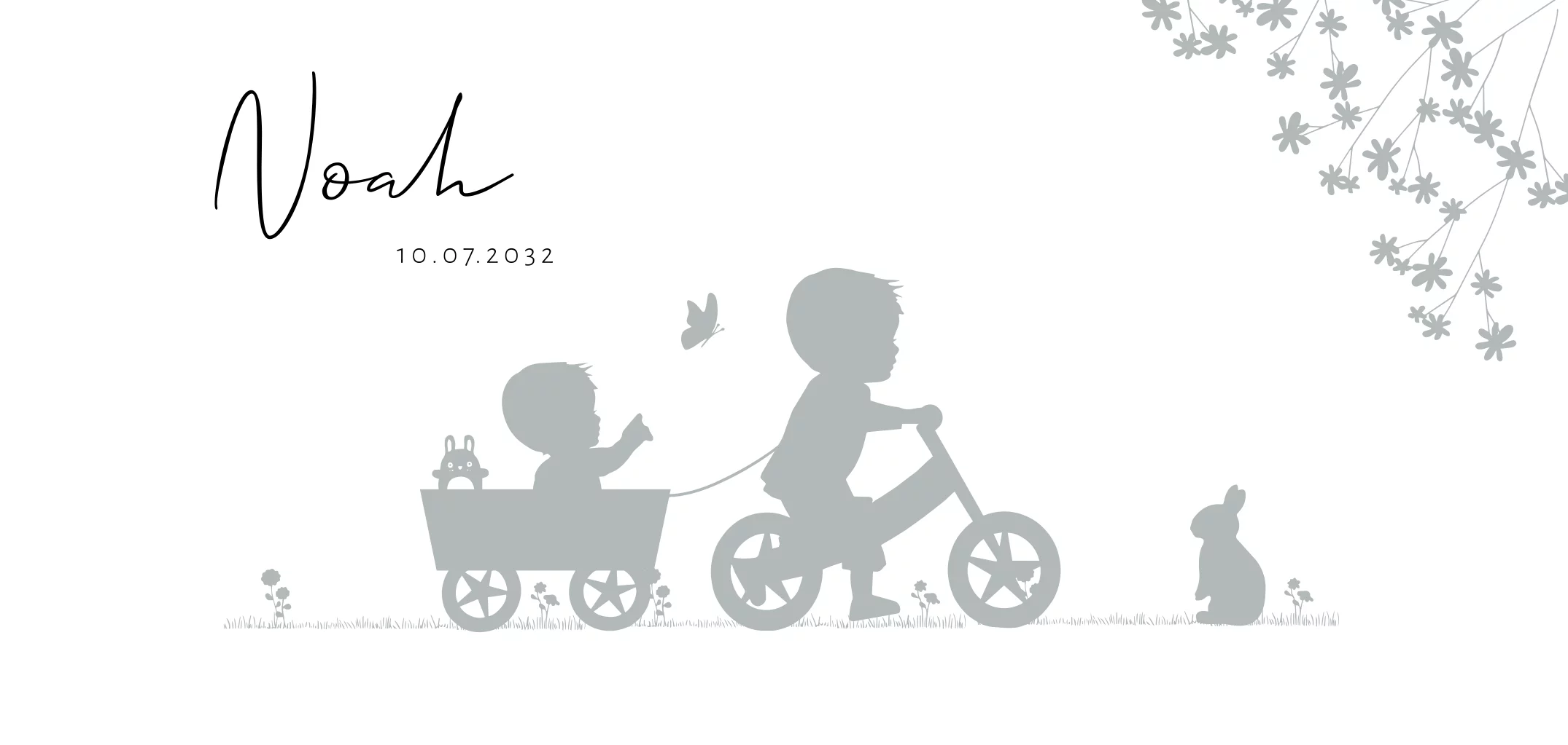 Mooi strak en stijlvol geboortekaartje van een broertje met loopfiets en karretje met baby broertje. Bloemenboom met grijs en konijntje maken het geheel mooi af.