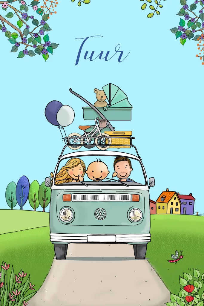 Kleurrijk en vrolijk geboortekaartje van baby jongen in busje aqua met ouders. Deze afbeeldingen kun je naar wens uit de clipart kiezen.