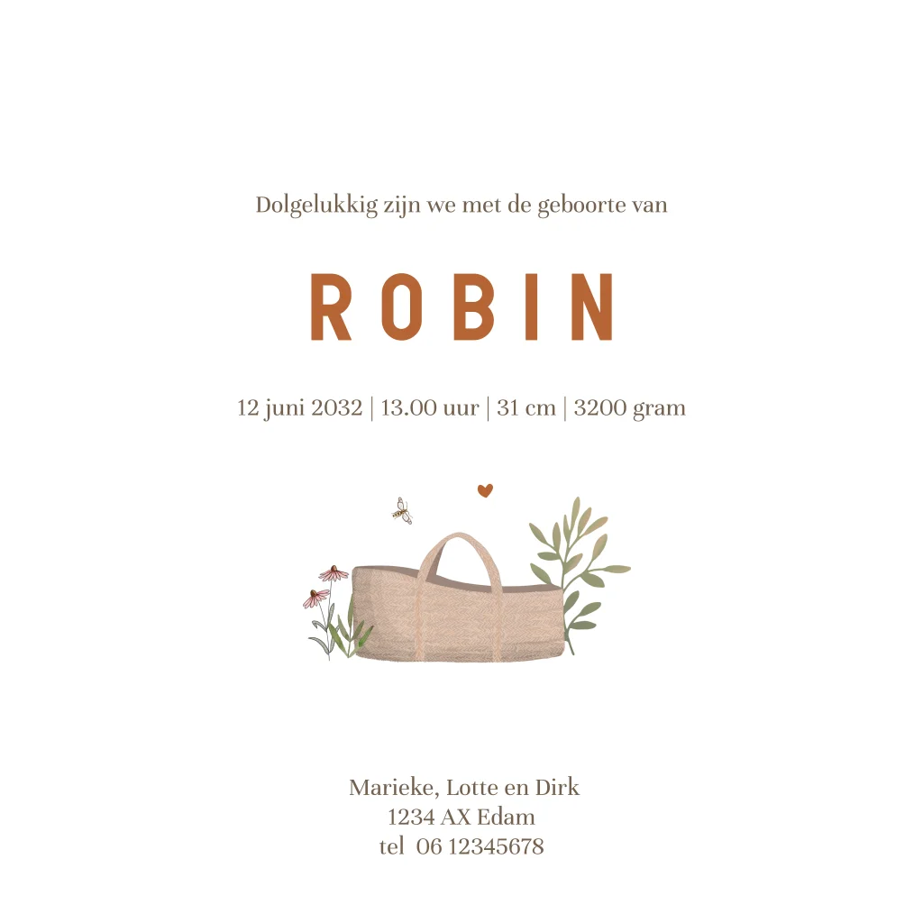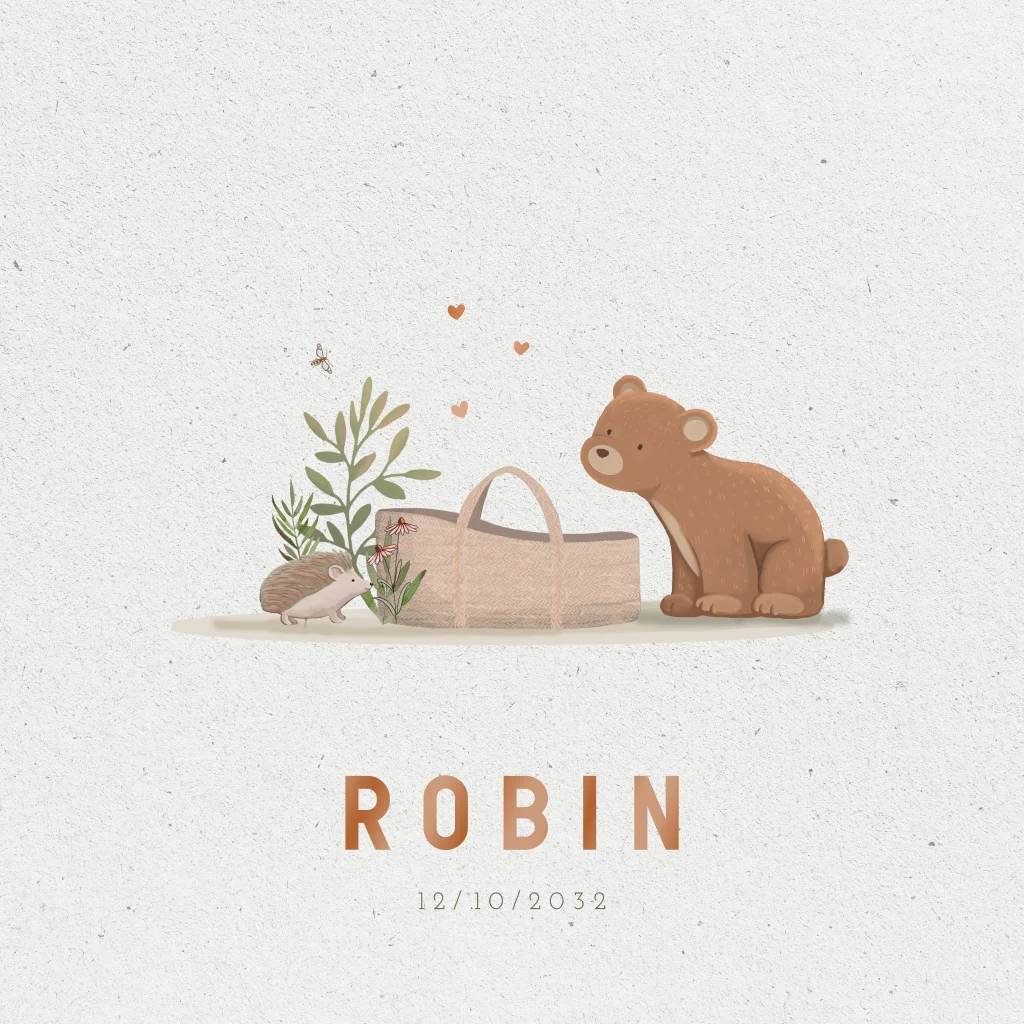 Super lief en schattig geboortekaartje van een kleine beer die in het mandje kijkt, lieve egel met takjes en hartjes maken het kaartje helemaal af.