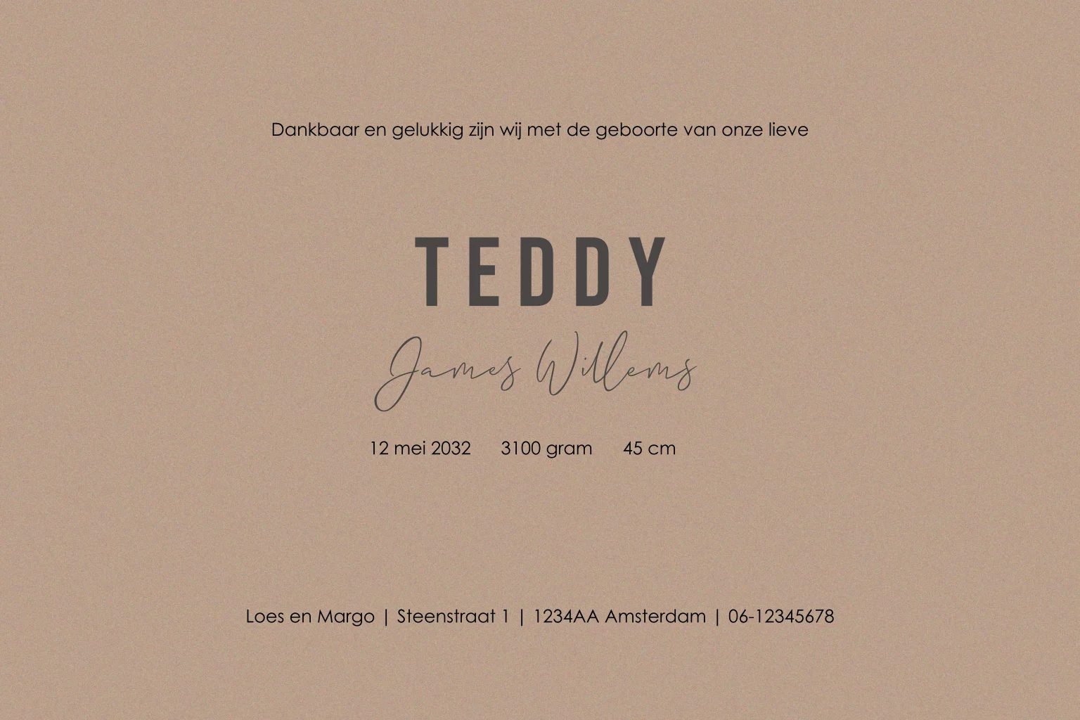 Nieuw leven is een avontuur, en dat moet gevierd worden! Wat is een betere manier om het avontuur te vieren dan met dit geboortekaartje beertjes in kraftlook papier? Dit unisex kaartje is perfect voor een stoere jongen of een lieve meisje. Het minimalistische ontwerp en de getekende dieren zullen zeker indruk maken op alle gasten.