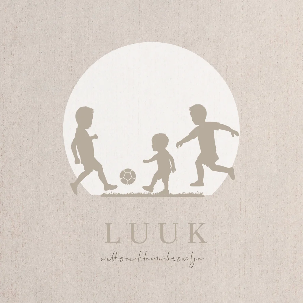 Geboortekaartje van drie broertjes aan het voetballen. Wat een plezier samen.