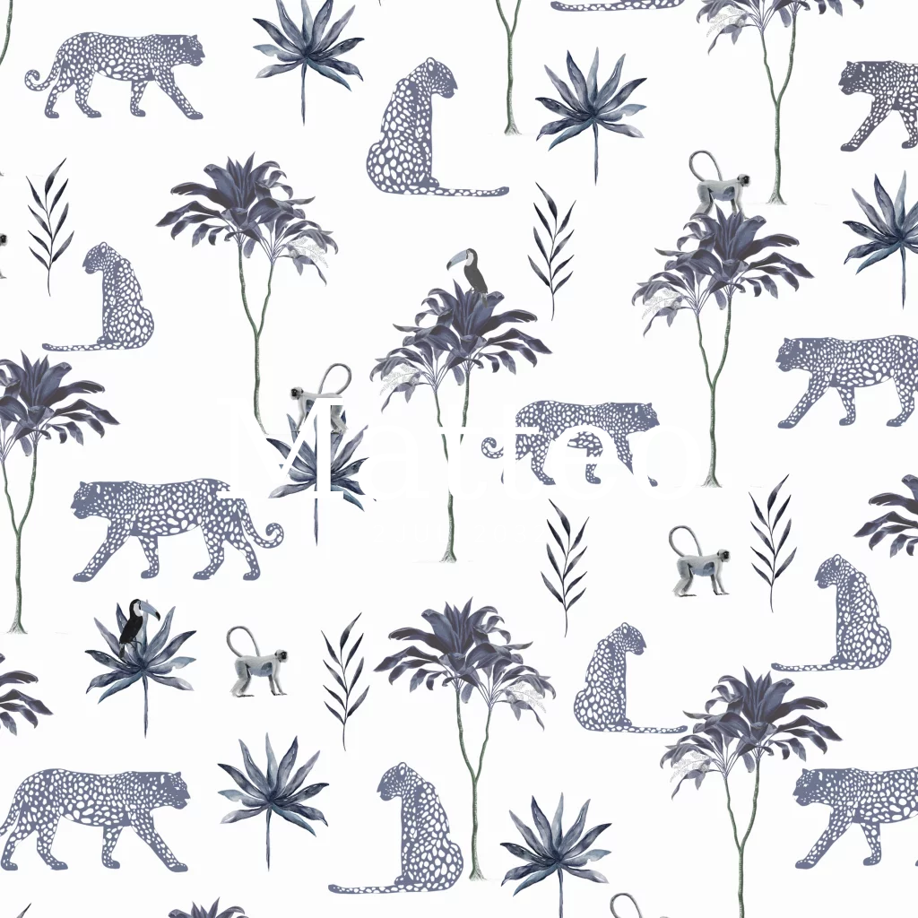 Prachtig geïllustreerd geboortekaartje in mooie delftsblauwe tinten met luipaard en aap met takjes en bomen