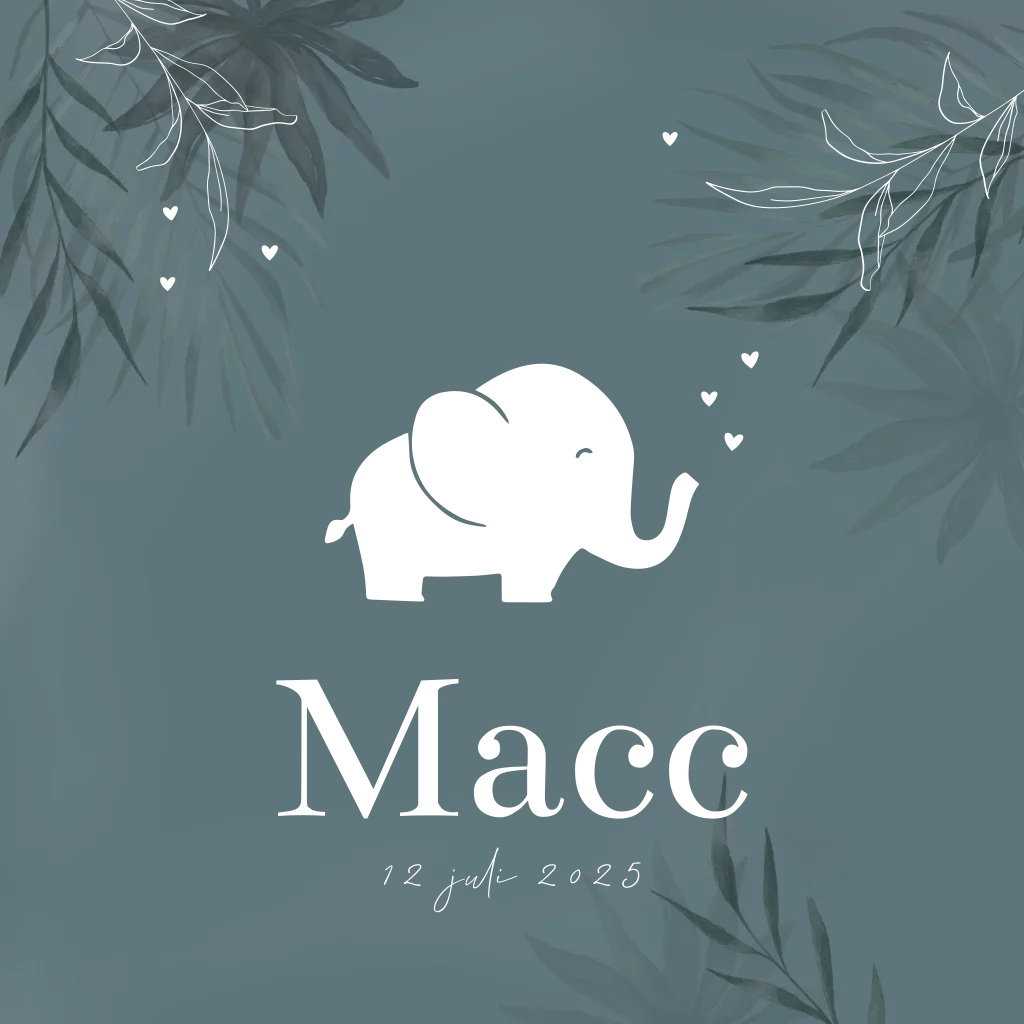 Geboortekaartje lief olifantje met hartjes en takjes en prachtige velvet groene achtergrond.