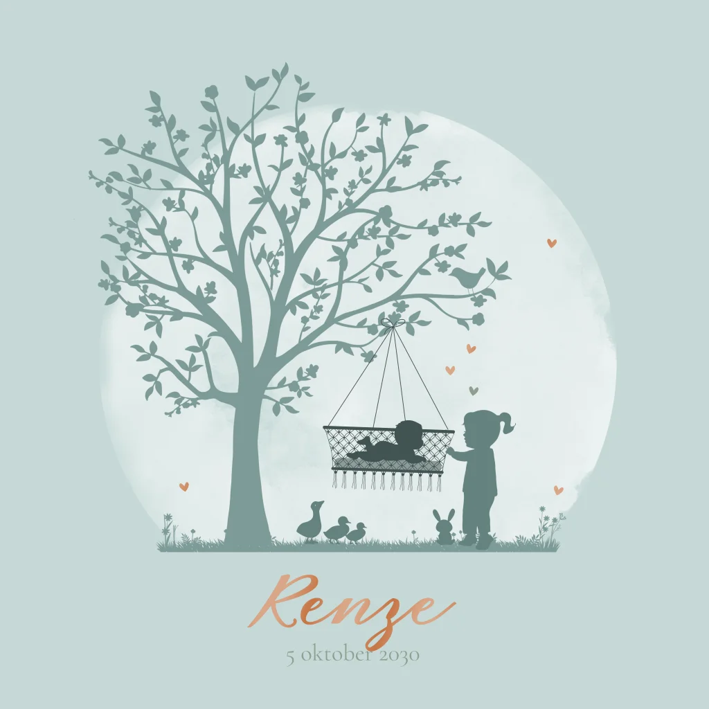 Mooi voorjaar lente geboortekaartje hangwiegje met zusje en mooie lenteboom met vogel. Kleine eendjes en een lieve knuffel maken het helemaal af.