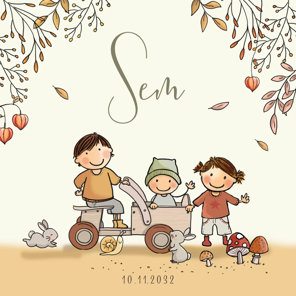 Geboortekaartje herfst broertje in houten kar met zusje en grote broer. Blaadjes vallen naar beneden, leuke paddestoelen, konijntje en slakjes maken het kaartje helemaal herfst.