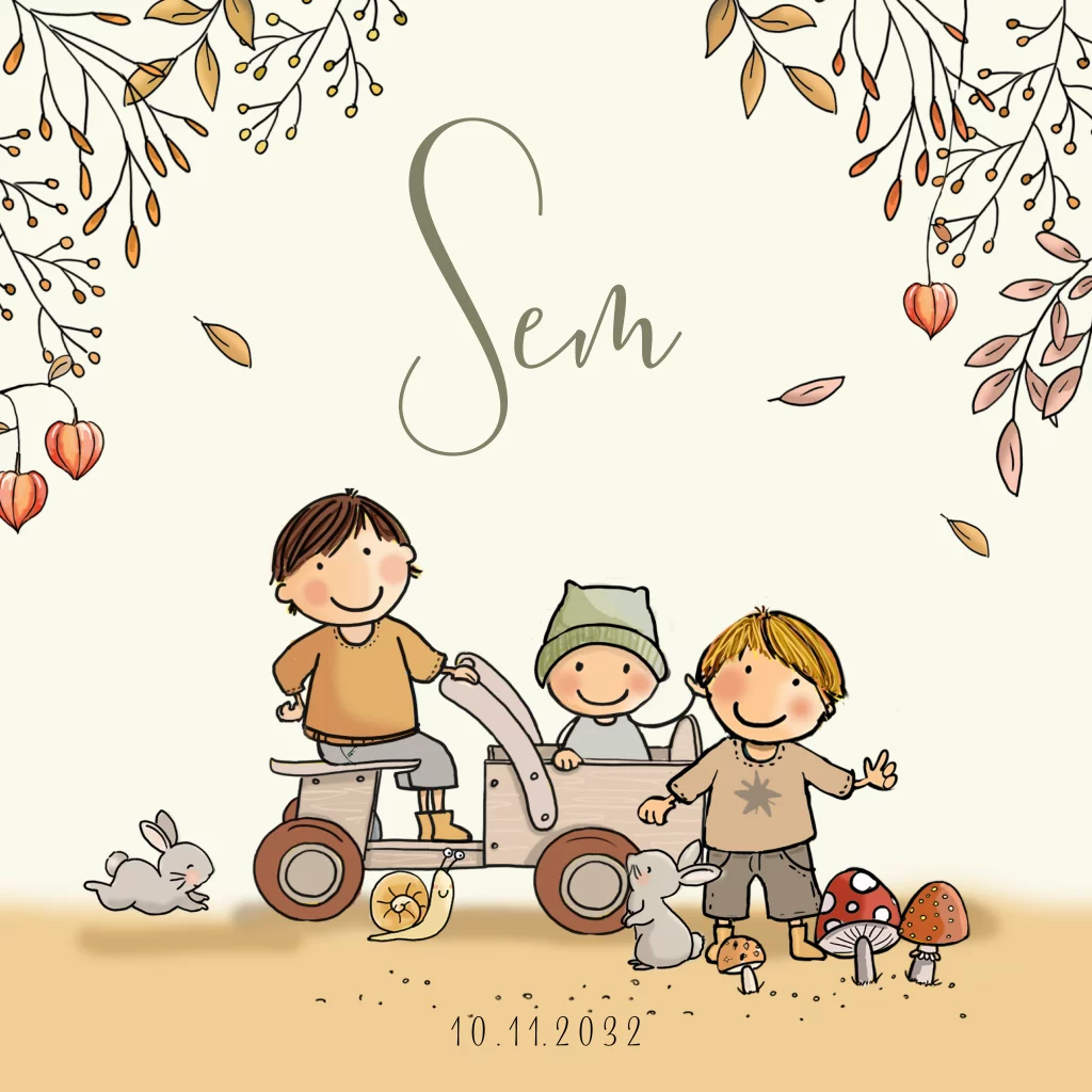 Geboortekaartje herfst jongen in houten kar met broertjes. Blaadjes vallen naar beneden, leuke paddestoelen, konijntje en slakjes maken het kaartje helemaal herfst.