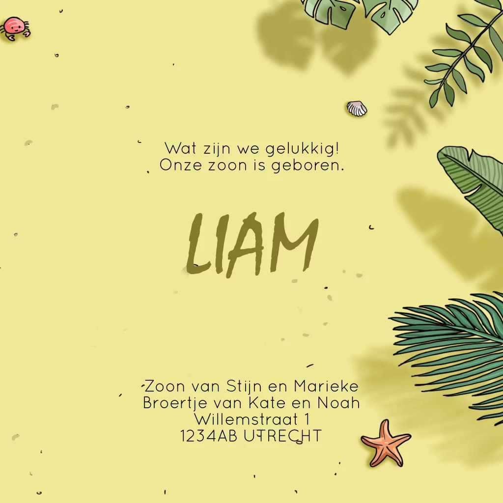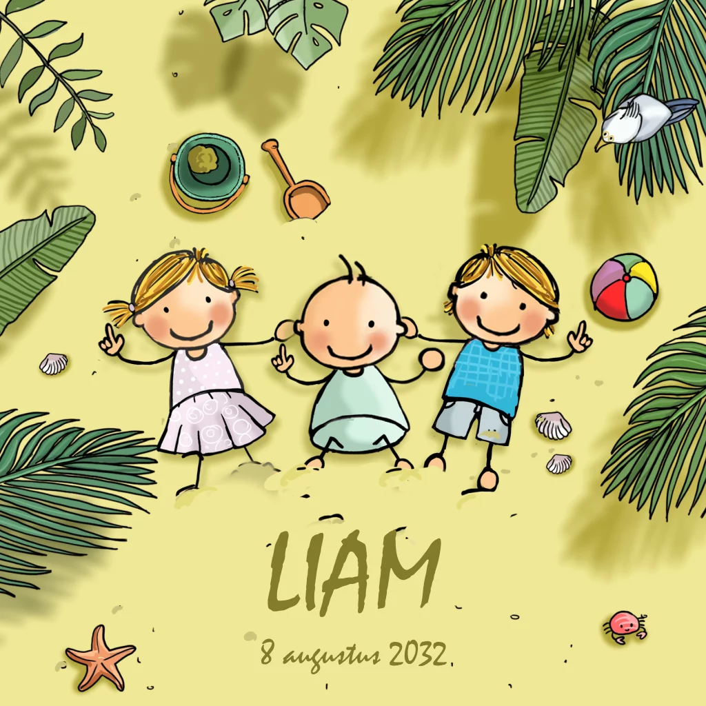 Geboortekaartje jongen baby strand met broertje en zusje, lief kaartje geheel met de hand geïllustreerd in heldere en vrolijke kleuren. Zomers en fris.