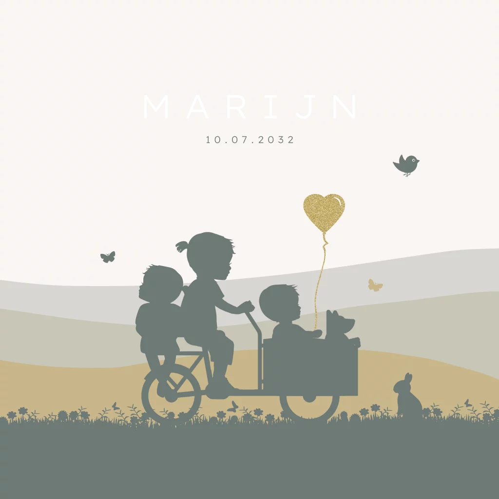 Geboortekaartje jongen bakfietsje met drie kinderen en hond