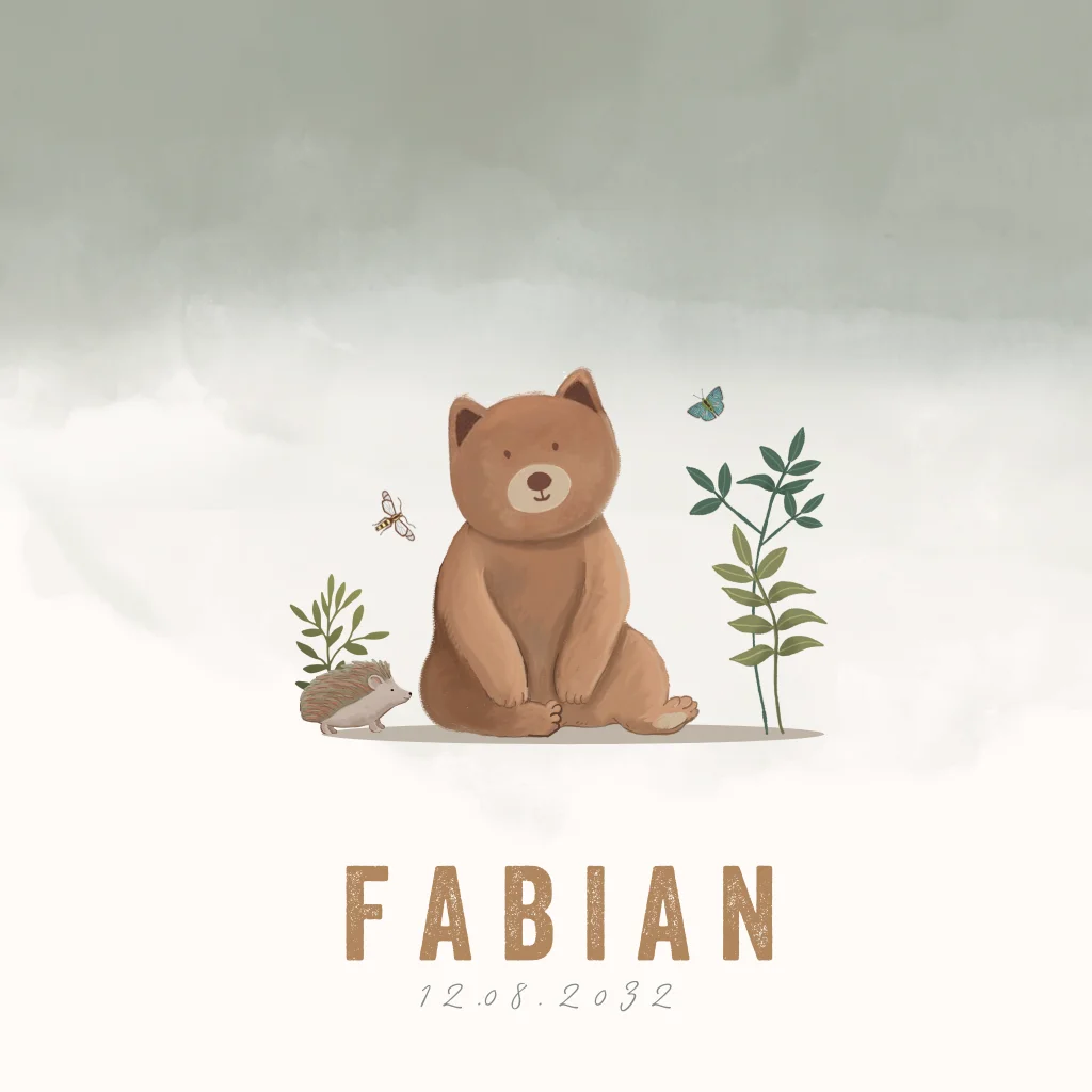 Geboortekaartje jongen beer met kleine egel, takjes en prachtige overloop achtergrond