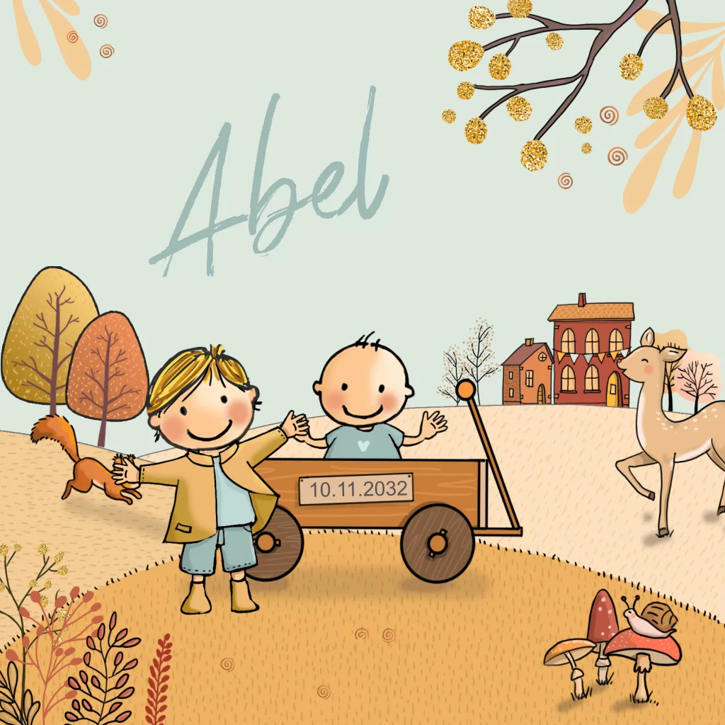 Prachtig geillustreerd geboortekaartje van een jongen en broertje in kar met herfst achtergrond. Lieve bosdieren zijn toegevoegd zoals een eekhoorn, ree, slak en egeltje.