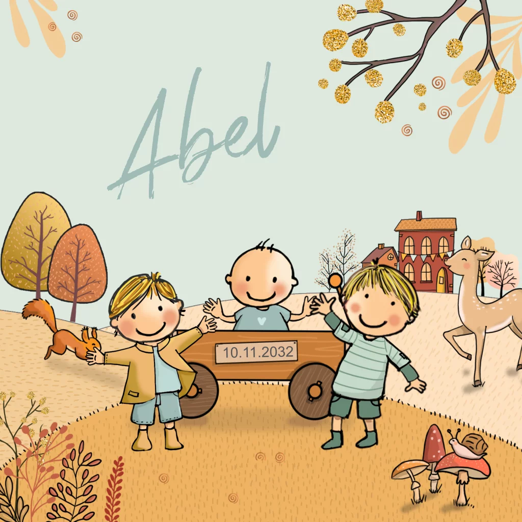 Prachtig geillustreerd geboortekaartje van een jongen en broertjes in kar met herfst achtergrond. Lieve bosdieren zijn toegevoegd zoals een eekhoorn, ree, slak en egeltje.
