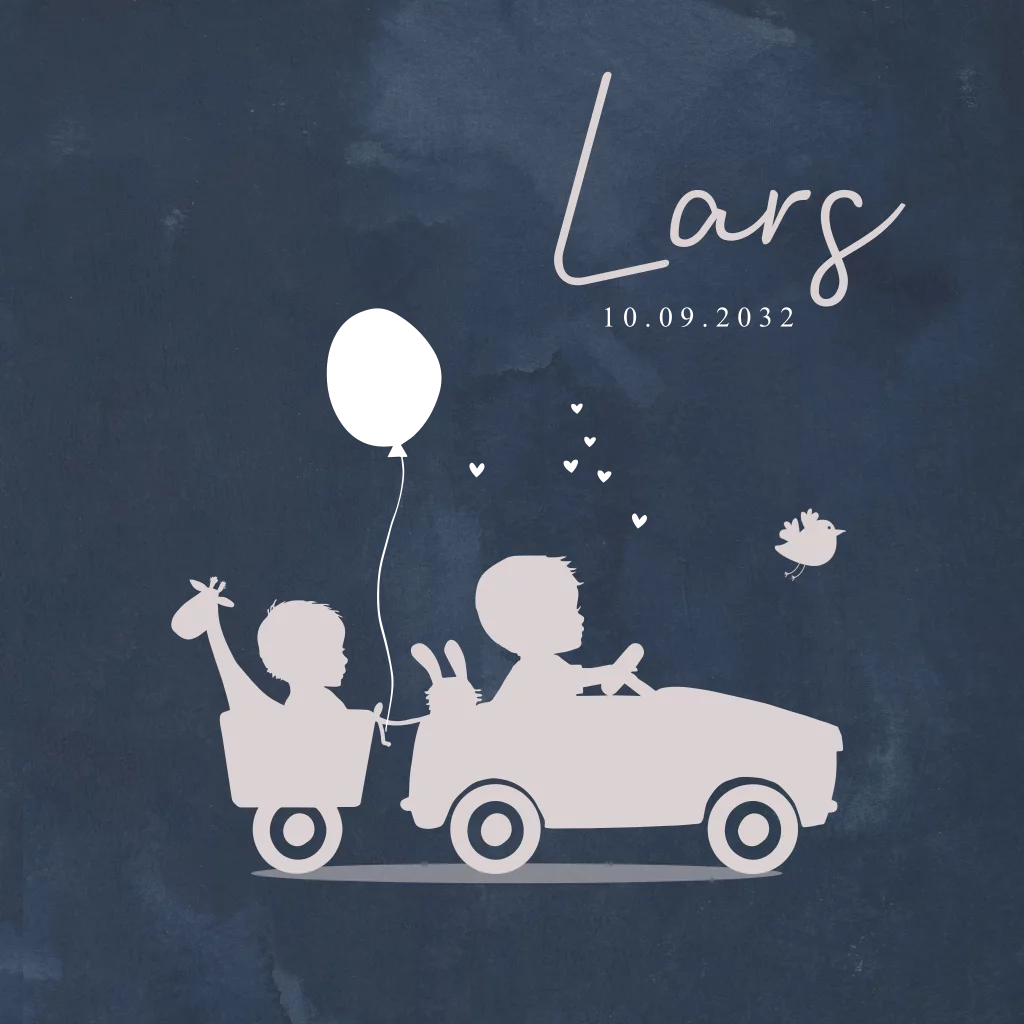 Geboortekaartje jongen en broertje in auto met aanhanger en prachtige watercolor achtergrond. Prachtig sfeervol geboortekaartje.