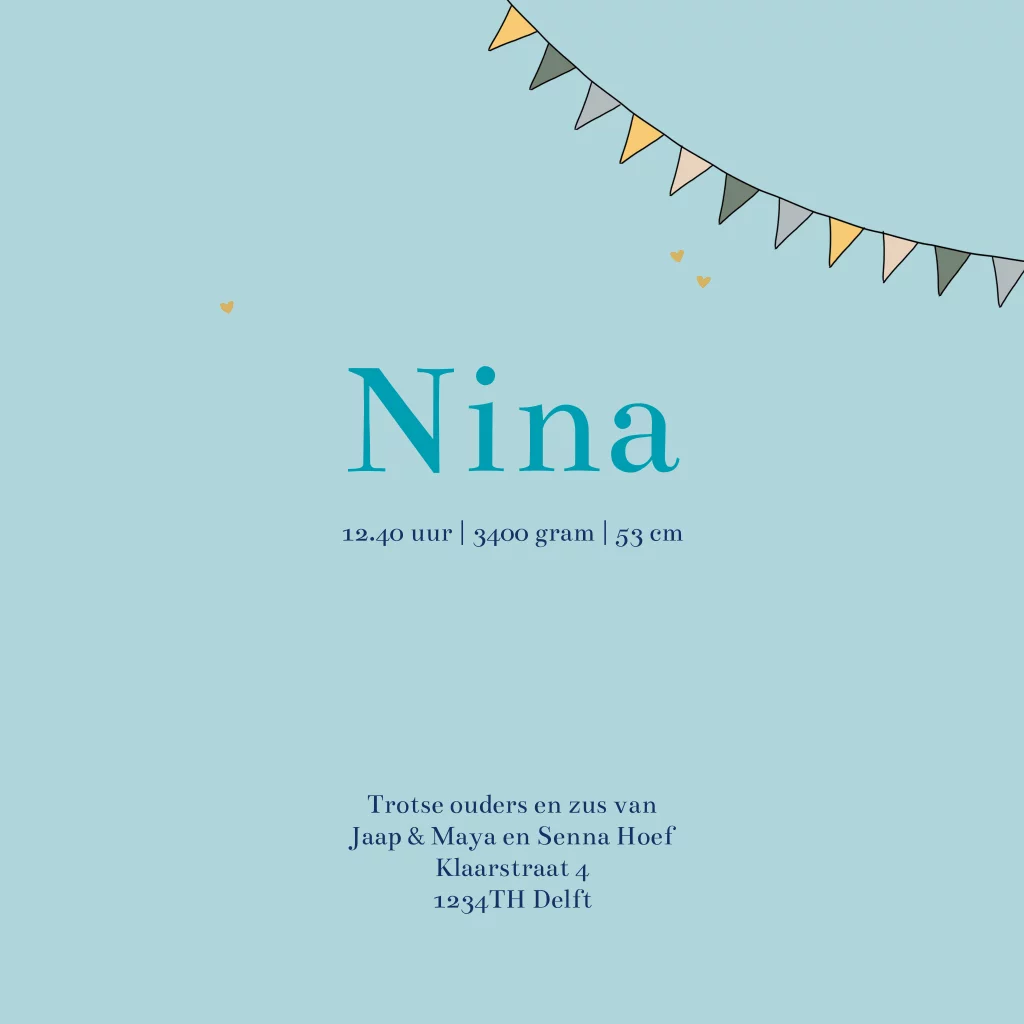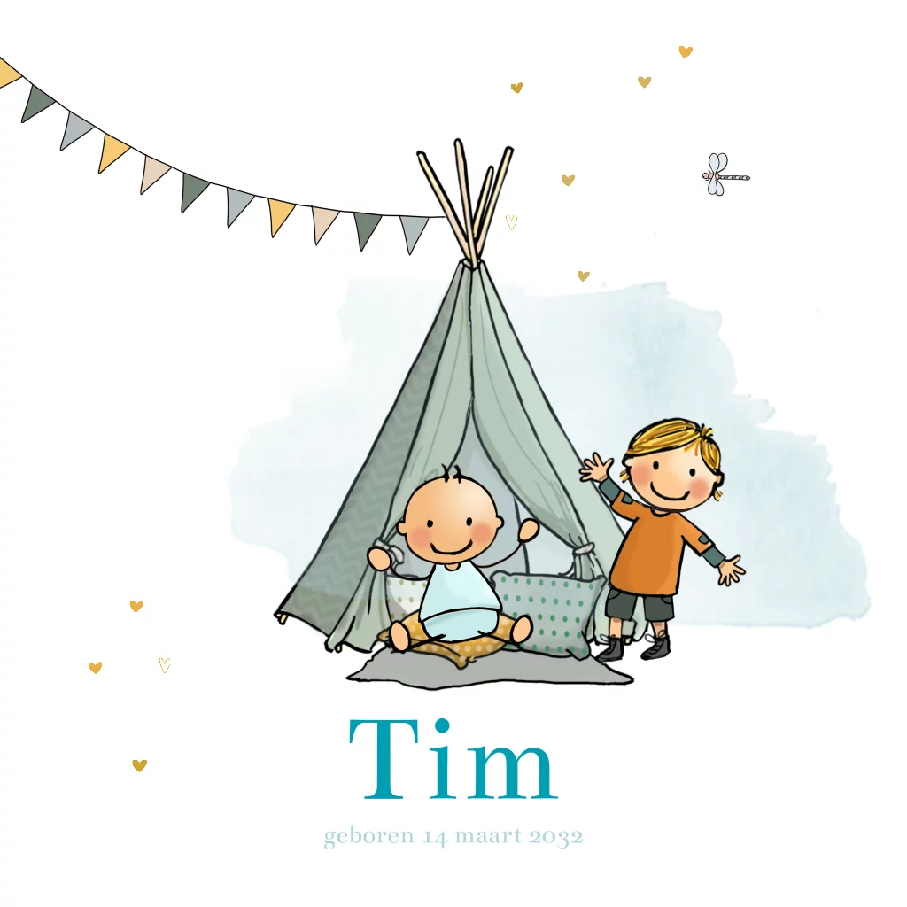 Geboortekaartje jongen en broertje tipi tent warmroze met vlaggetjes en watercolor