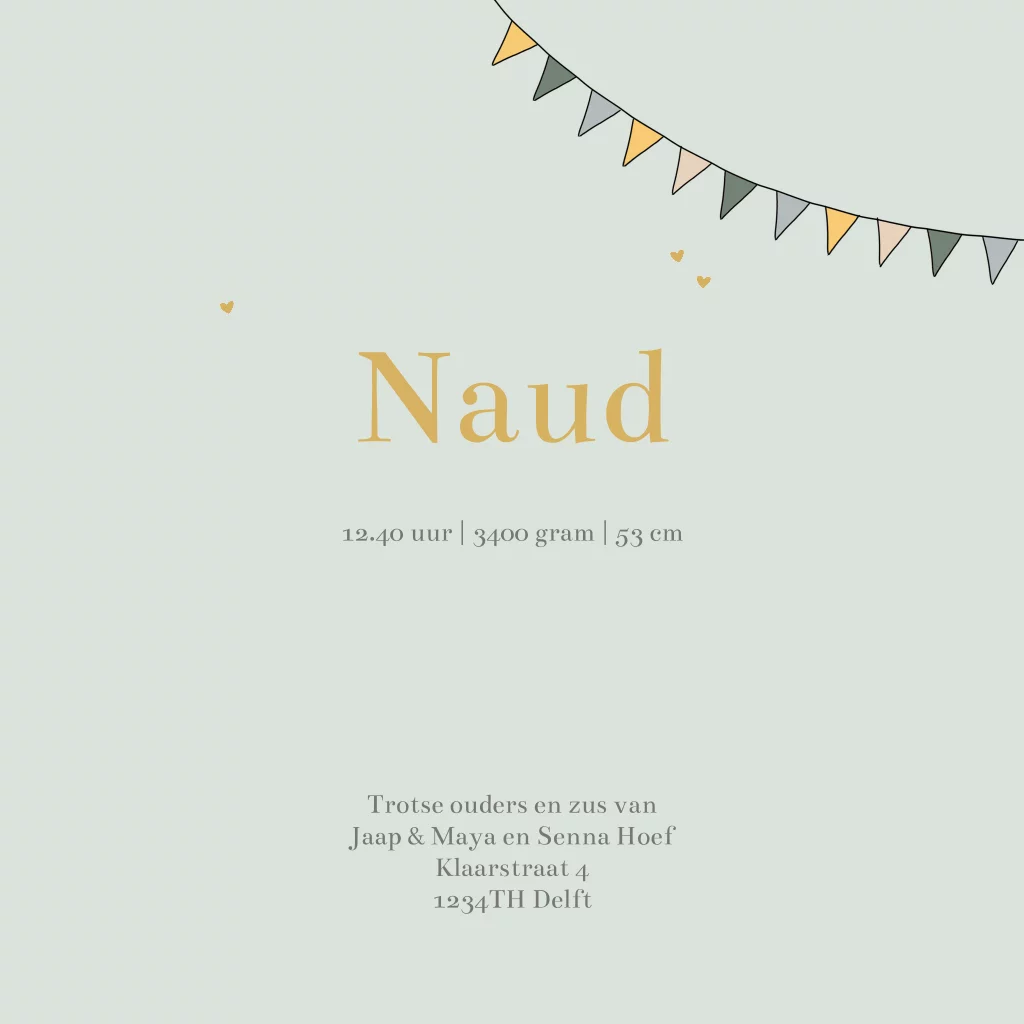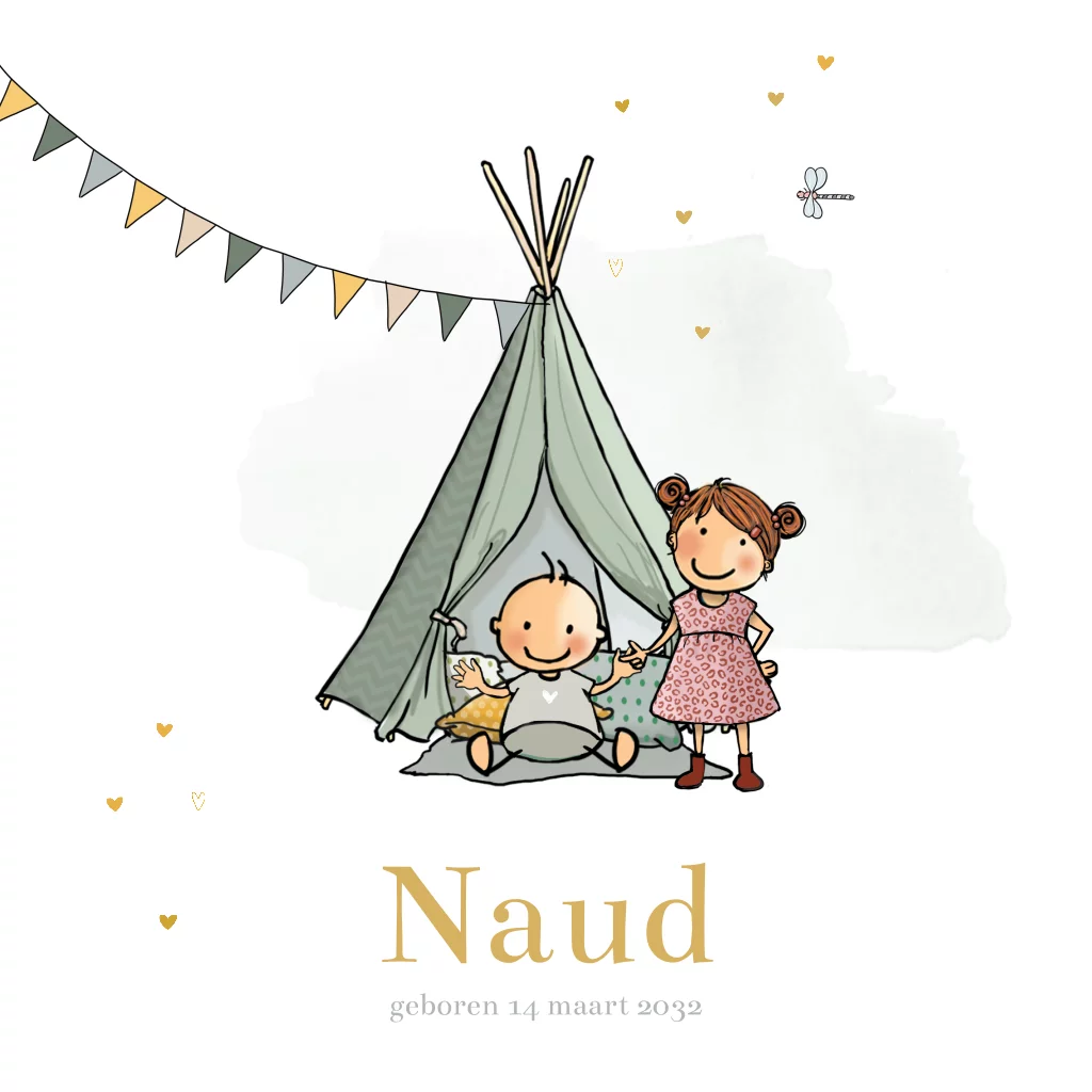 Geboortekaartje jongen en zusje tipi tent groen met vlaggetjes en watercolor