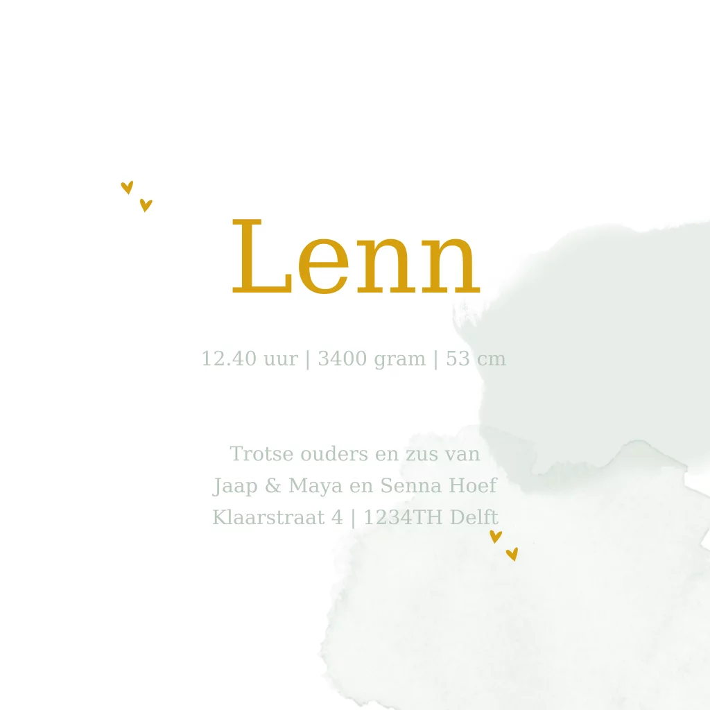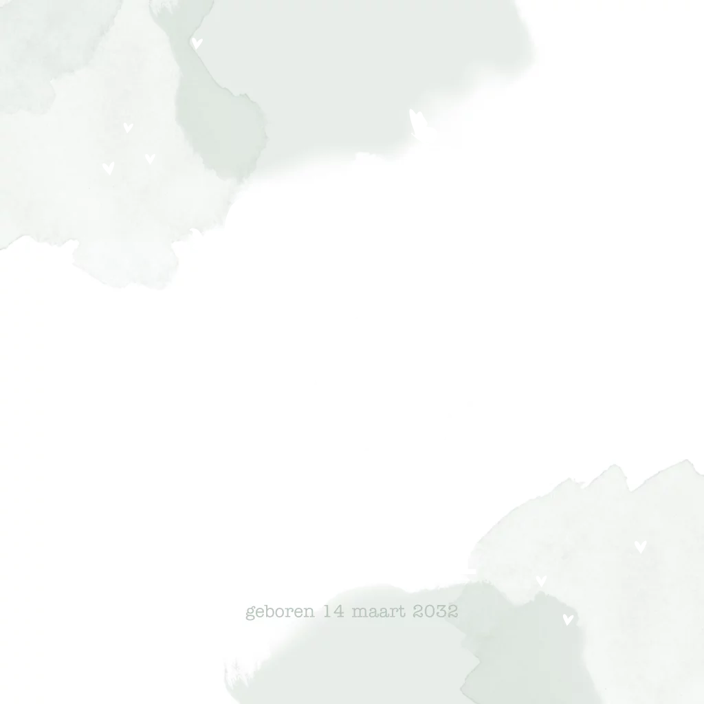 Geboortekaartje baby jongen en broertje en grote zus geven elkaar een handje, illustratie met watercolor en hartjes. Foliedruk maken het geheel af.