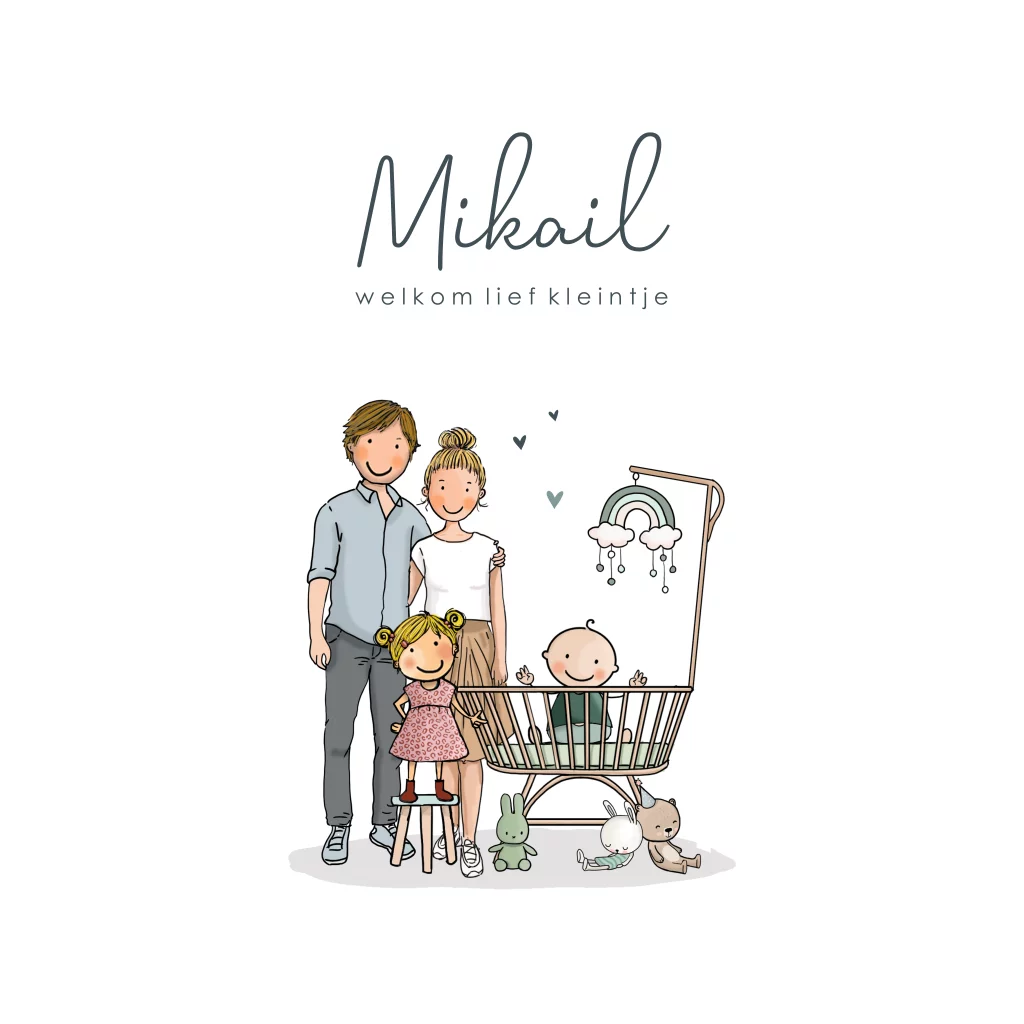 Geboortekaartje jongen in rotan wiegje met regenboog, knuffels, meisje en ouders. In de clipart staan vele leuke ouders die je kunt uitzoeken. Teksten zijn ook naar wens aanpasbaar.