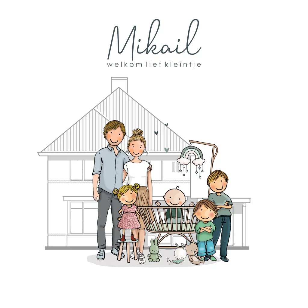 Geboortekaartje jongen in rotan wiegje met regenboog, knuffels, zusje, broertjes en ouders. In de clipart staan vele leuke ouders die je kunt uitzoeken. Teksten zijn ook naar wens aanpasbaar.