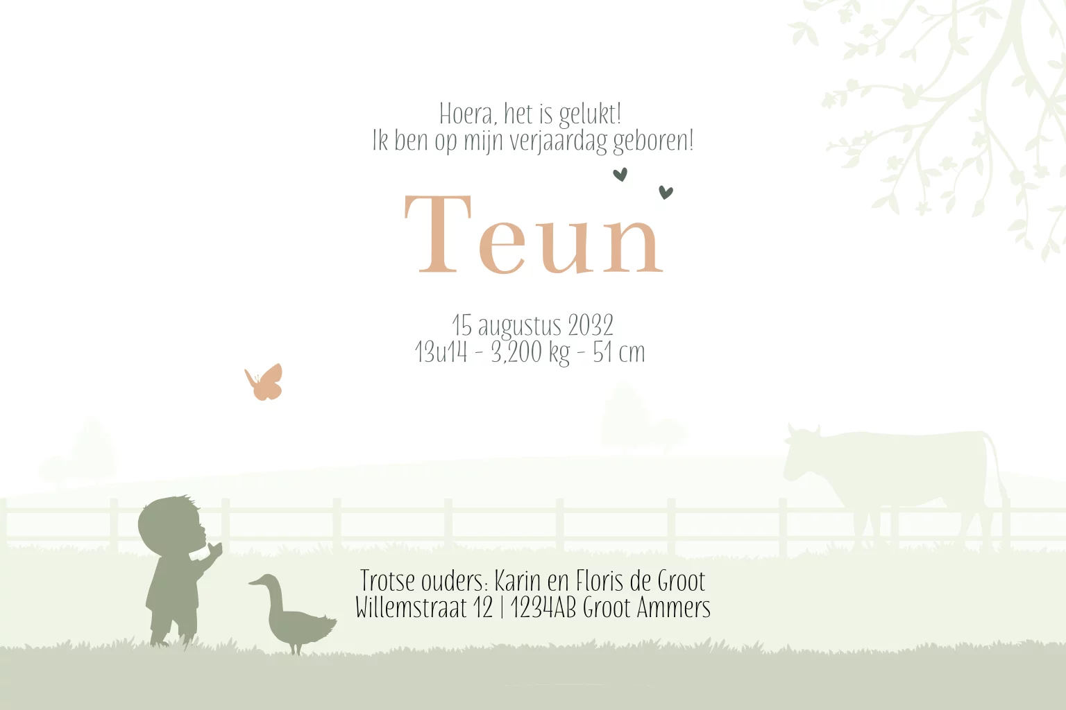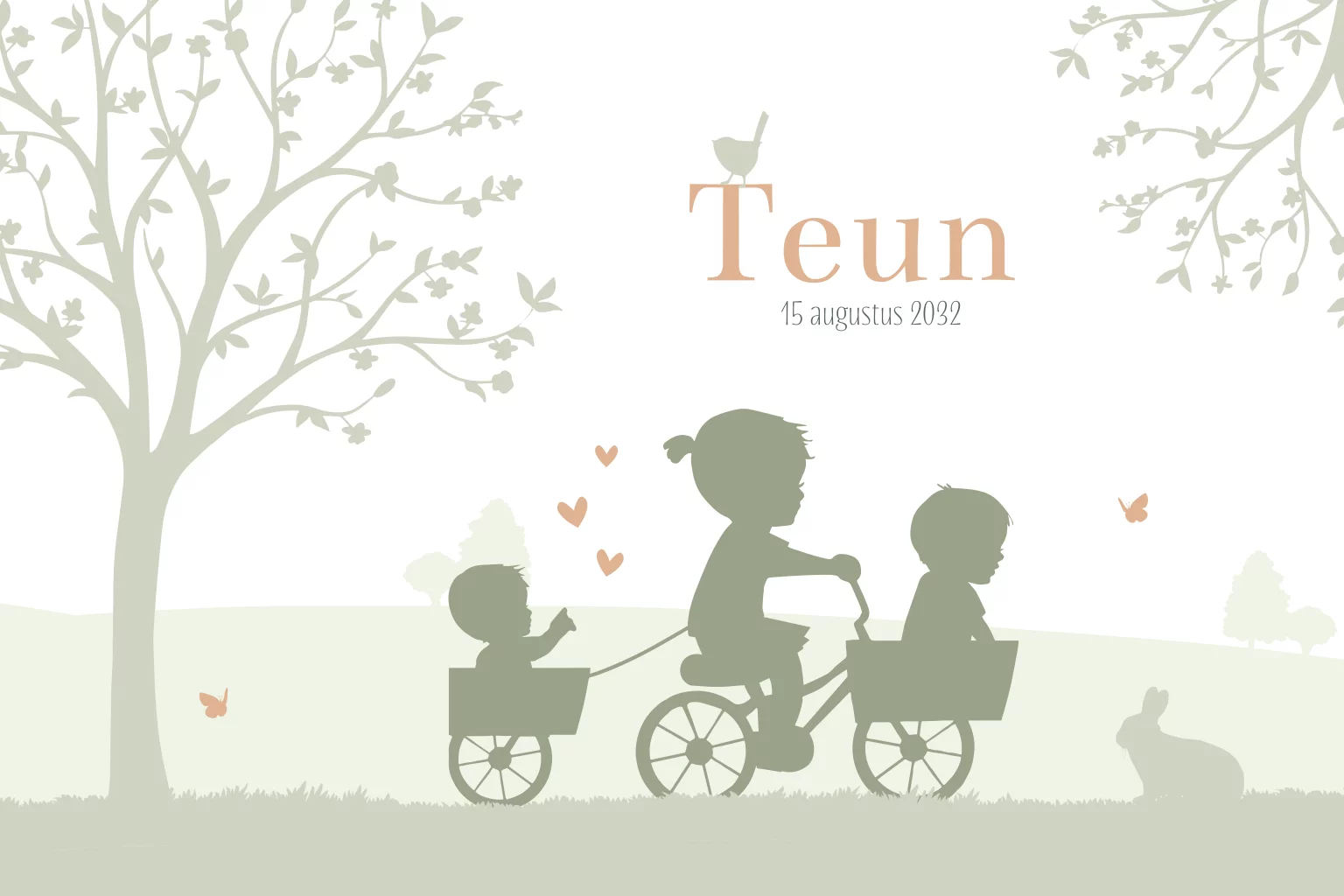 Geboortekaartje jongen in kar met zusje en broertje op fiets, prachtige achtergrond met landschap en mooie boom. Kleine diertjes maken het kaartje af. Het is een perfect kaartje voor een jongen die geboren wordt als tweede of derde kindje.