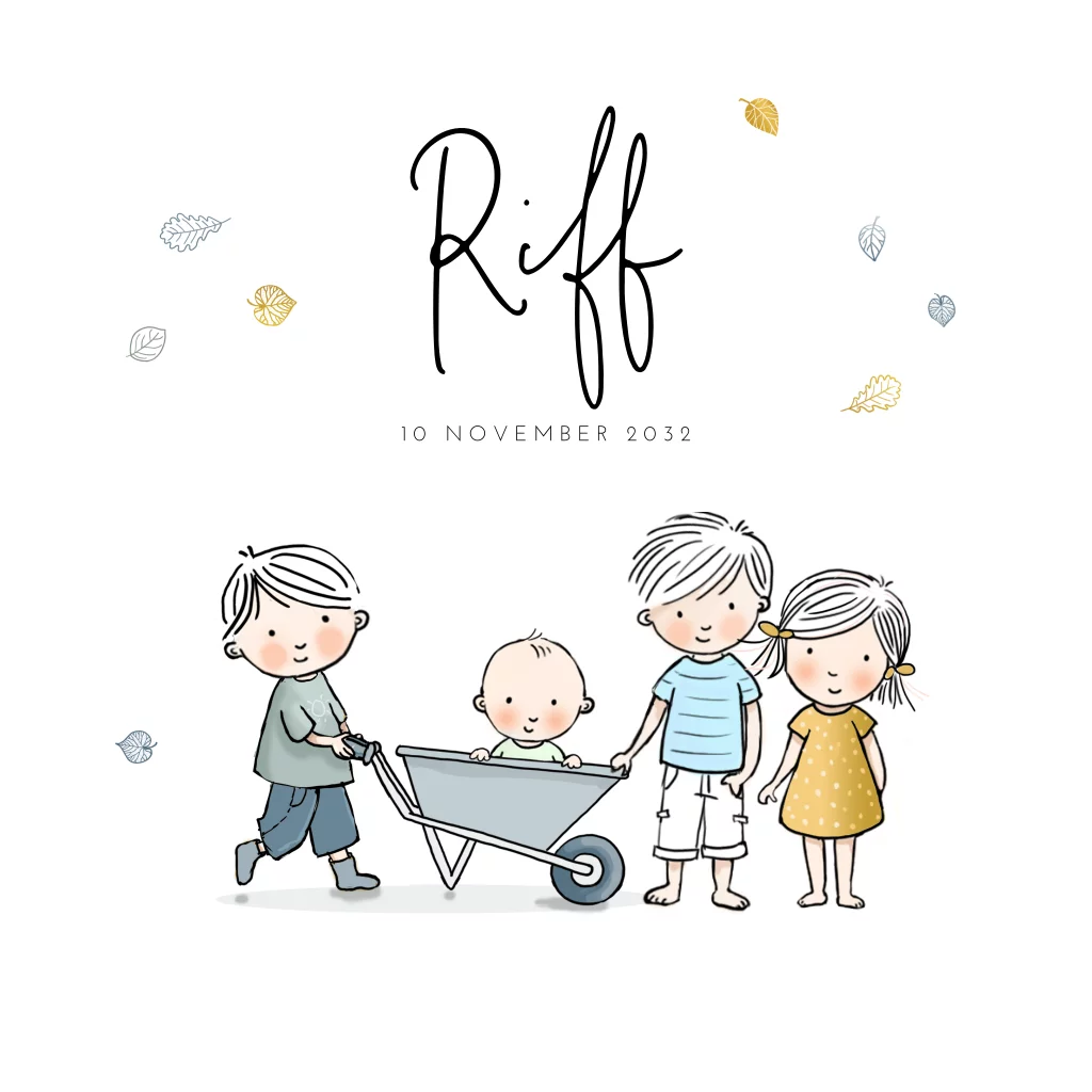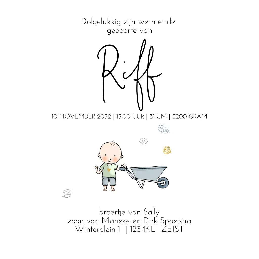 geboortekaartje jongen kruiwagen met broertjes zusje
