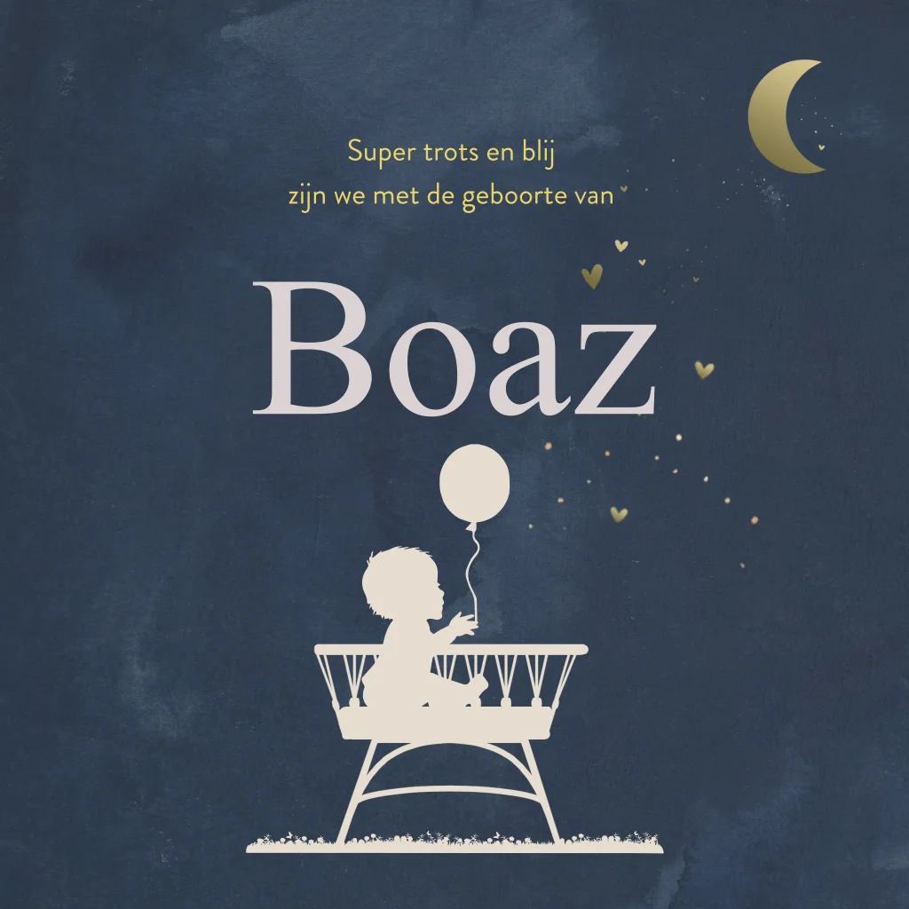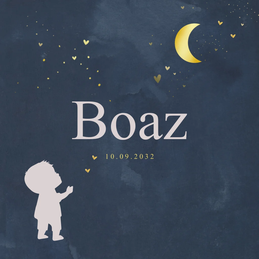 Geboortekaartje jongen met prachtige donkerblauwe watercolor achtergrond, maantje met sterren en silhouet van klein jongetje. Prachtig sfeervol geboortekaartje.