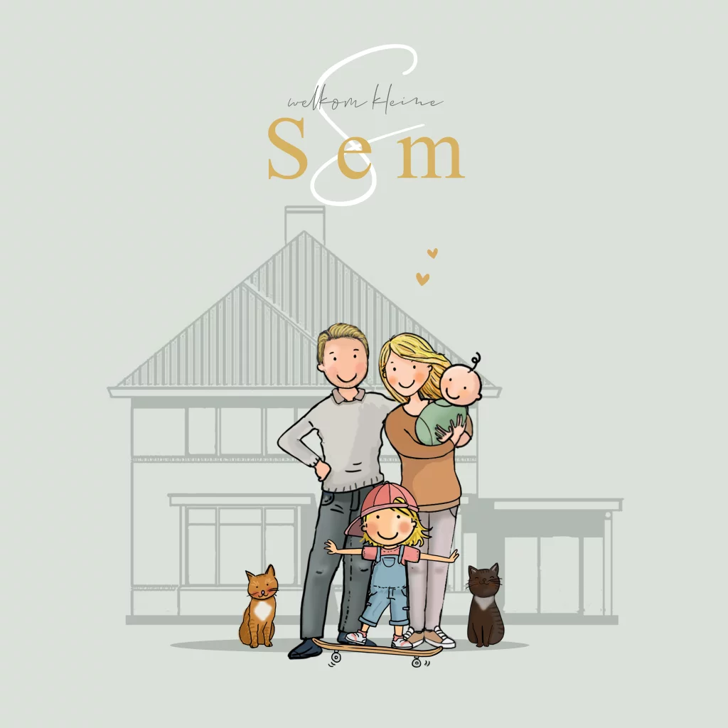 Geboortekaartje jongen met ouders en woonhuis. Onze geboortekaartjes zijn uniek en naar wens samen te stellen. In de clipart staan diverse illustraties van leuke ouders en kinderen. Zo maak je je eigen ontwerp. Bestel vandaag nog je geboortekaartje en maak je kaartje uniek met onze clipart!
