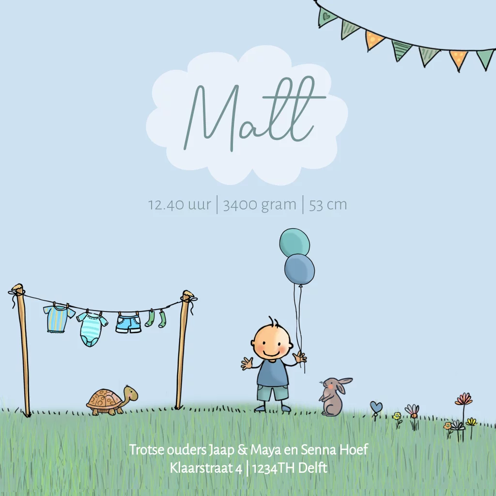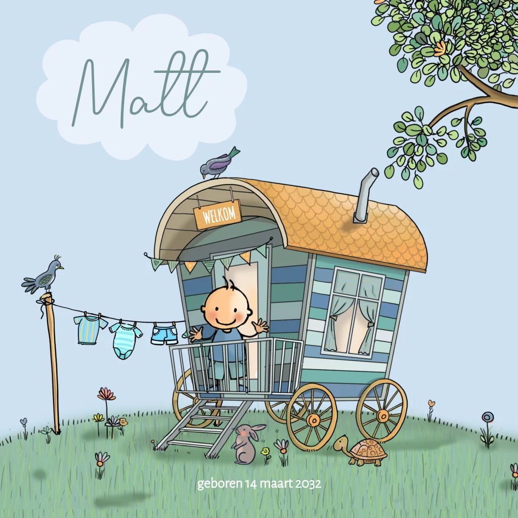 Geboortekaartje jongen pipowagen met vlaggetjes, mooie achtergrond in blauw en groen gras. Teksten zijn naar wens aanpasbaar.