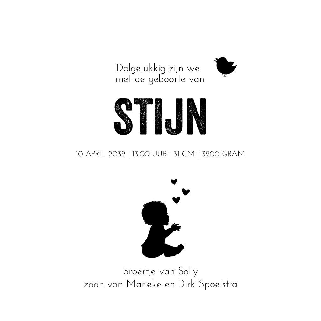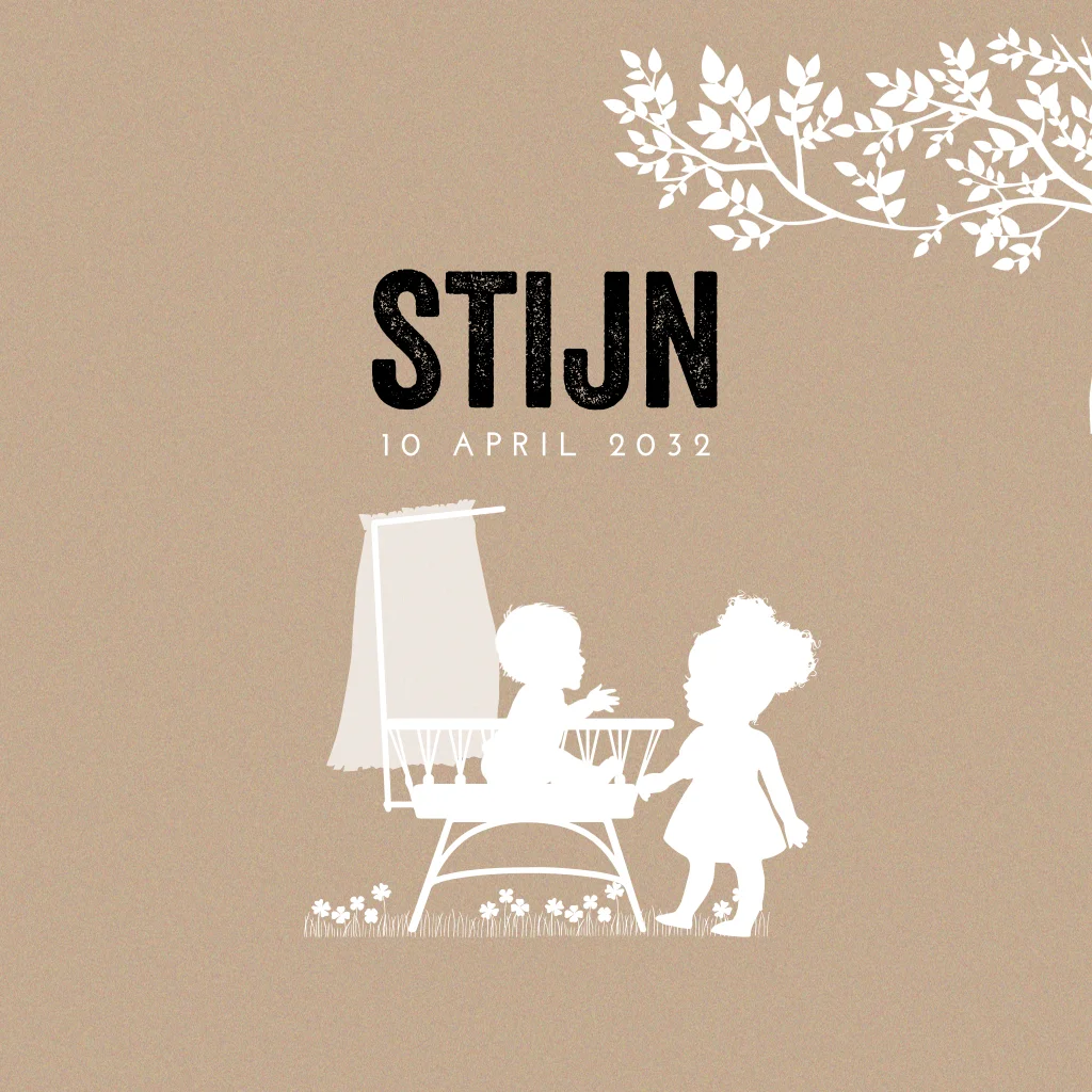 Geboortekaartje jongen in rotan wiegje met zusje. Mooie kraftlook achtergrond, teksten zijn naar wens aanpasbaar.