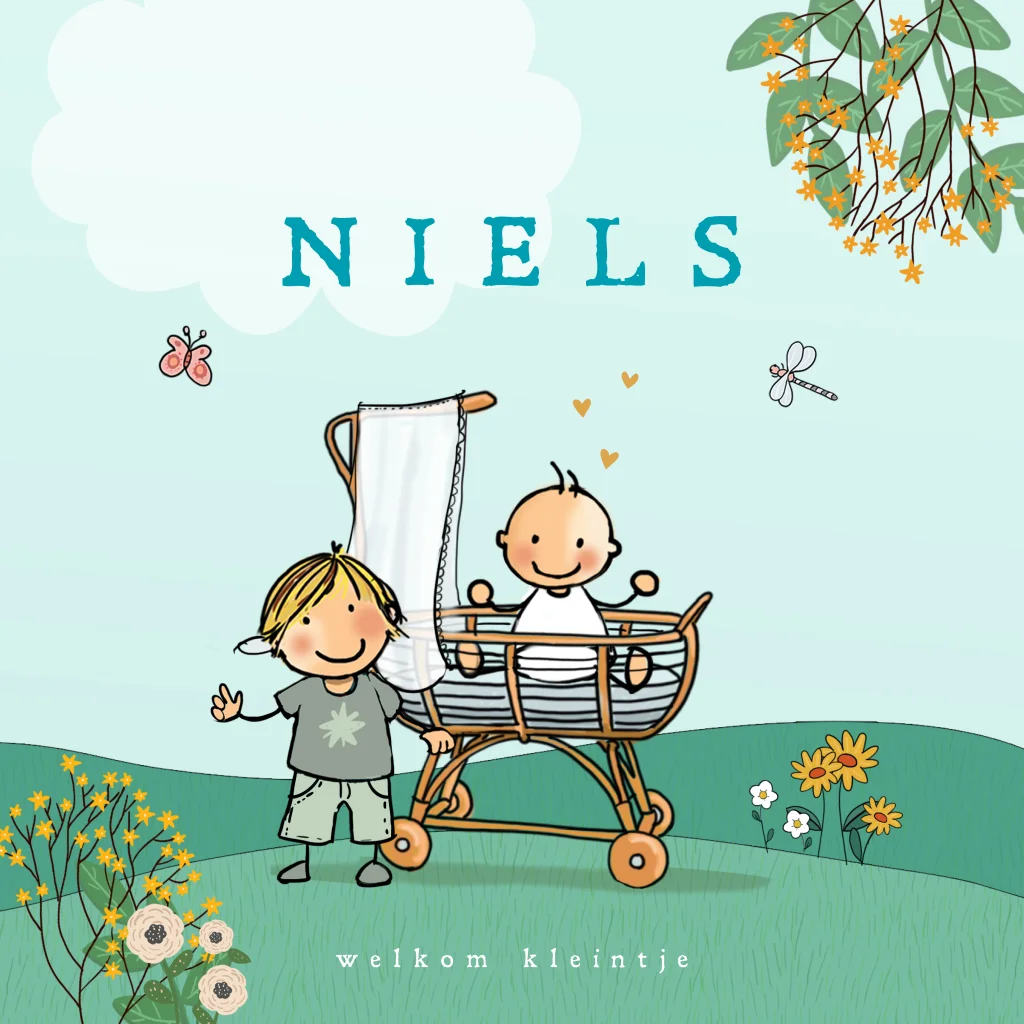 Geboortekaartje jongen rotan wiegje en broertje met natuur, vlinder, libelle en vele bloemen zorgen voor een vrolijke kaart.