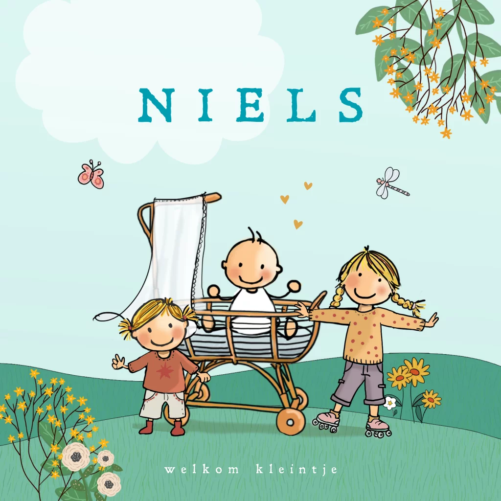 Geboortekaartje jongen rotan wiegje en zusjes met natuur, vlinder, libelle en vele bloemen zorgen voor een vrolijke kaart.