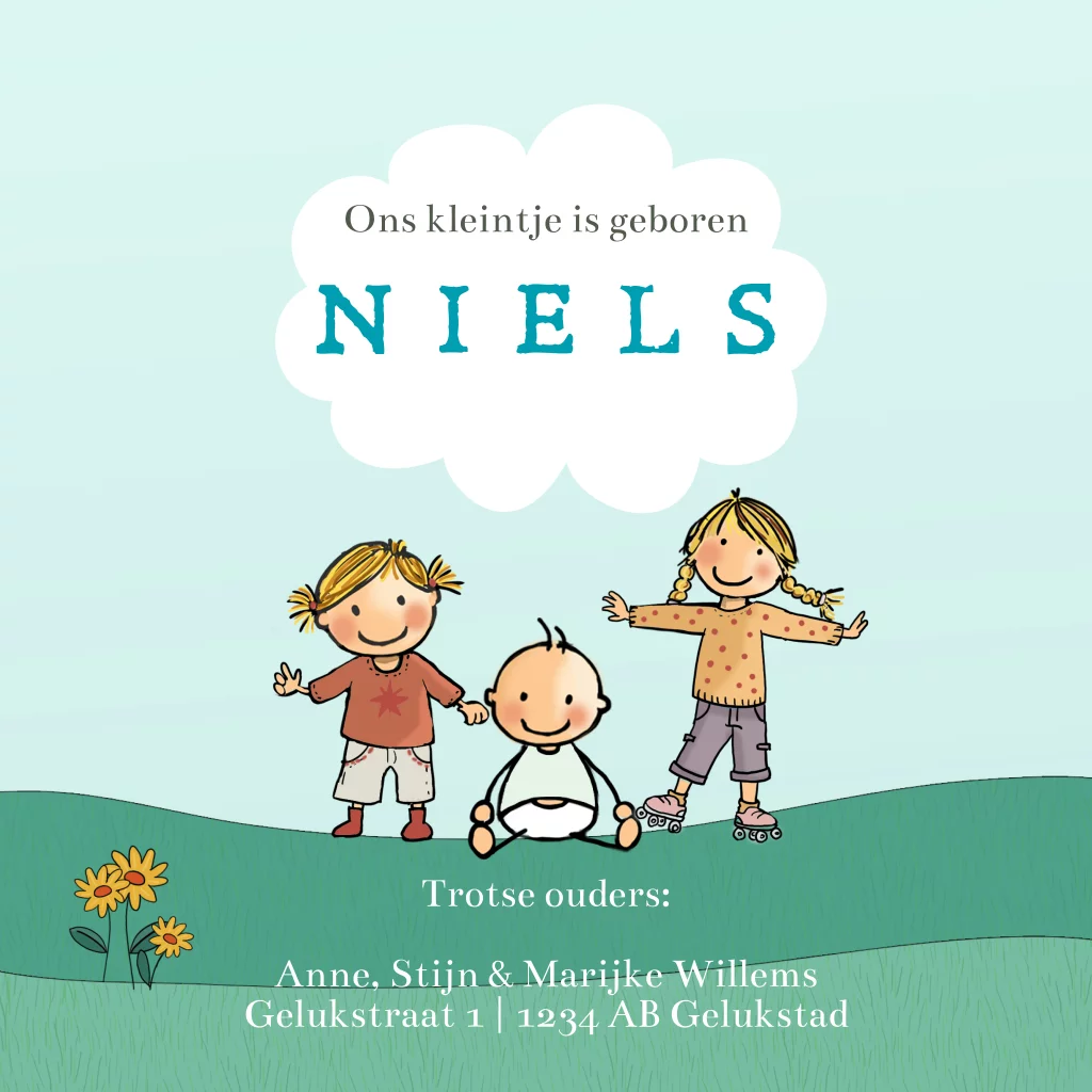 Geboortekaartje jongen rotan wiegje zusjes met natuur