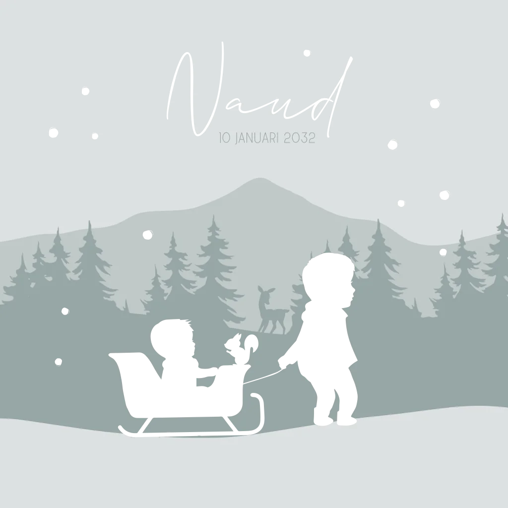 Geboortekaartje jongen slee met broertje en landschap folie, prachtig kaartje voor een meisje