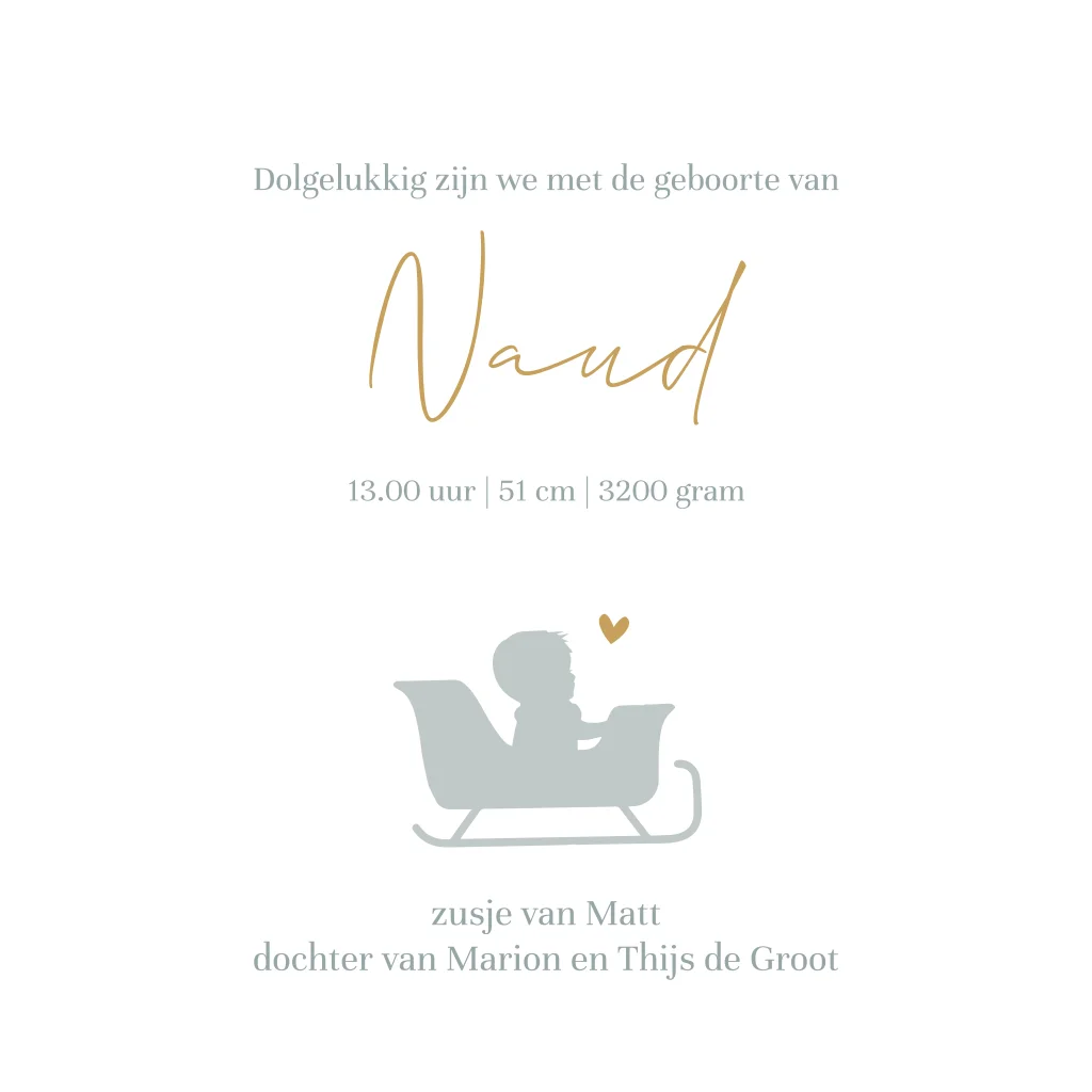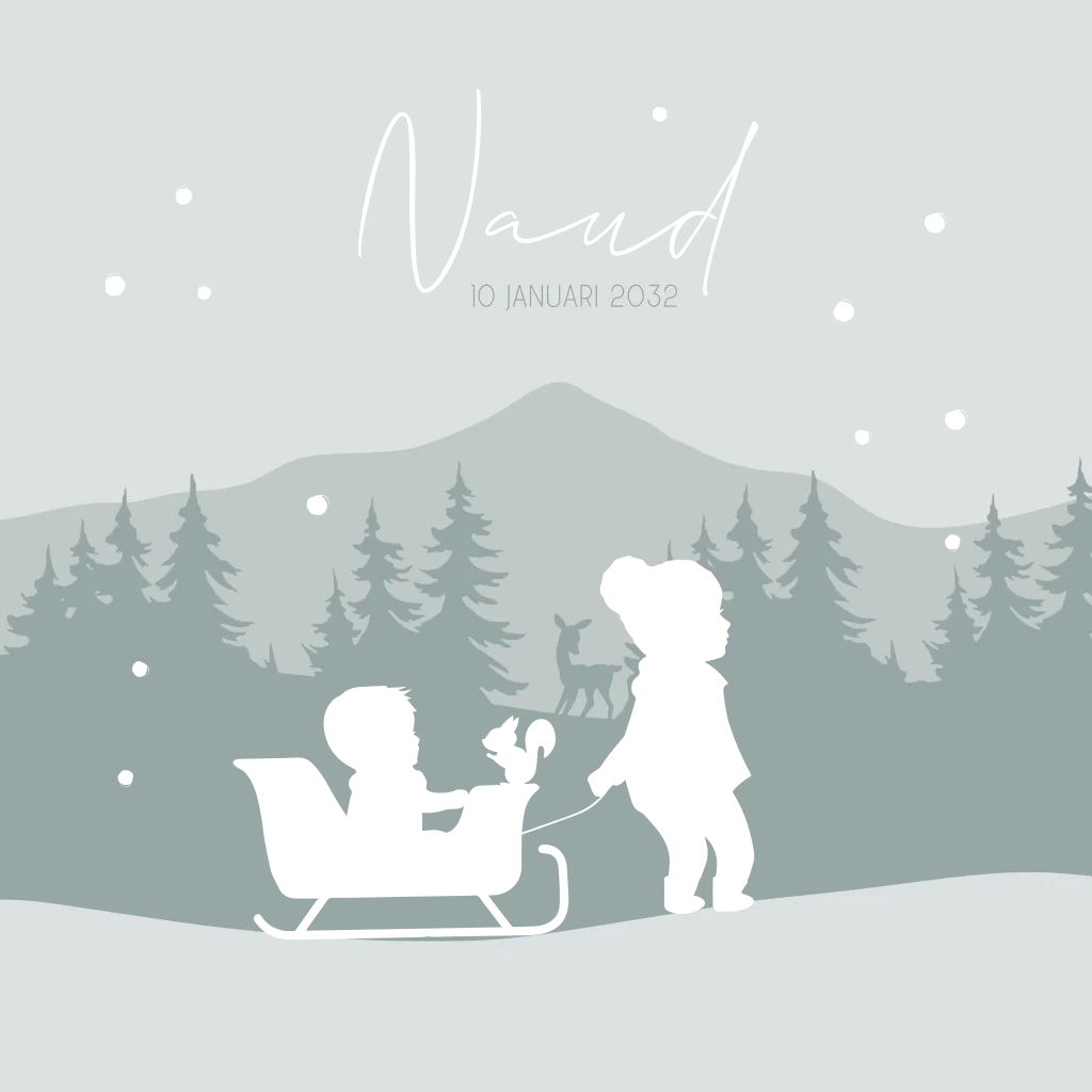 Geboortekaartje jongen slee met zusje en landschap folie, prachtig kaartje voor een meisje