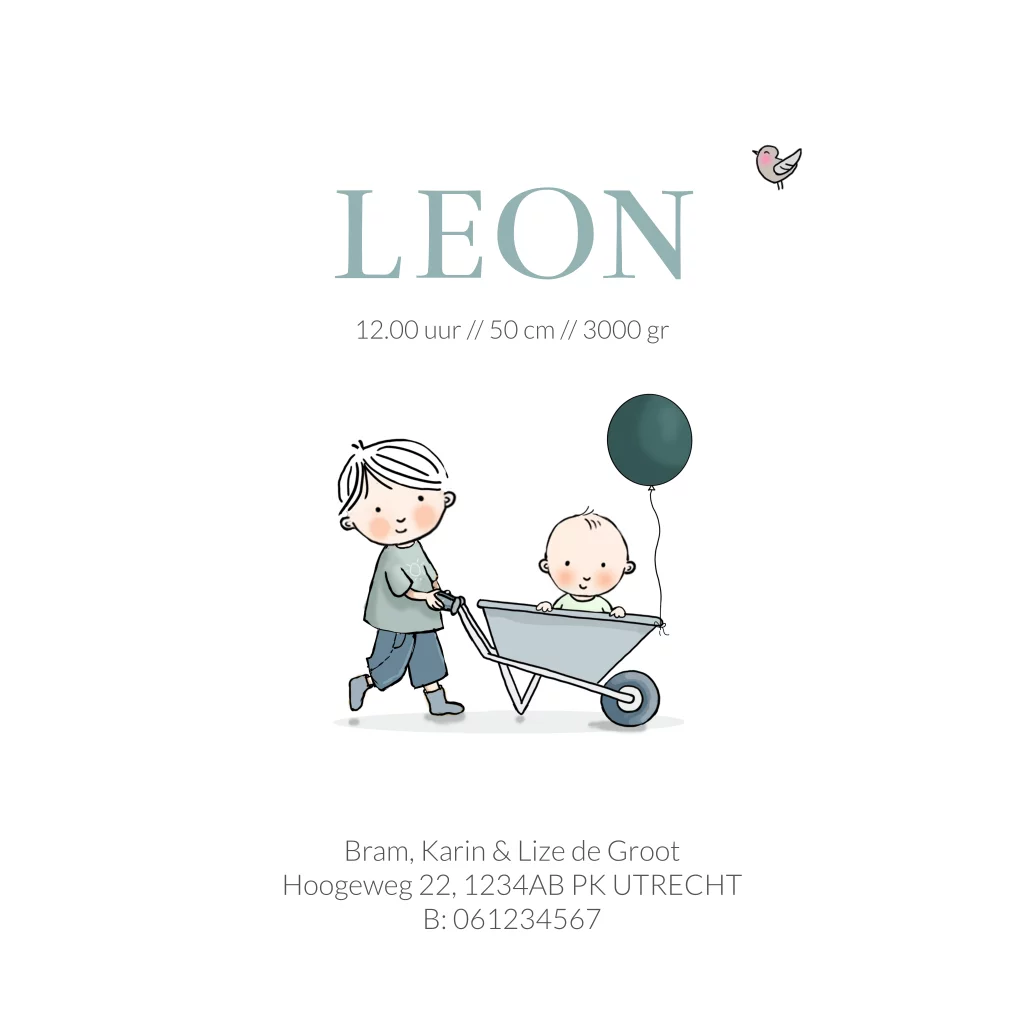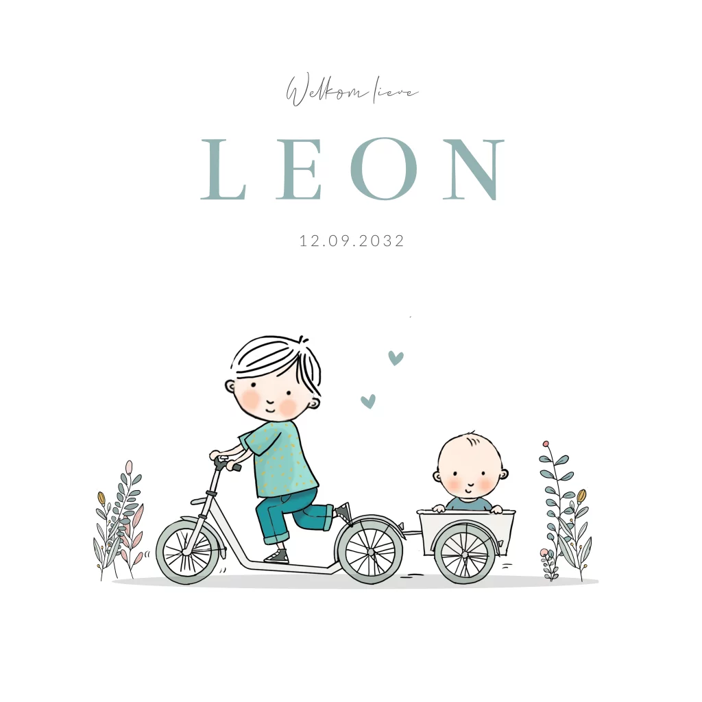 Geboortekaartje jongen step met aanhanger broertje. Teksten zijn naar wens aanpasbaar.