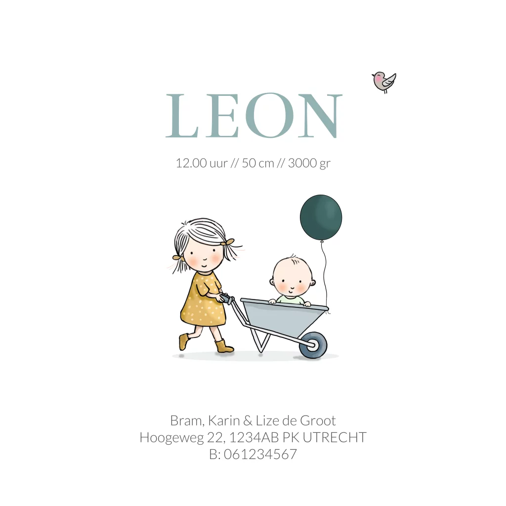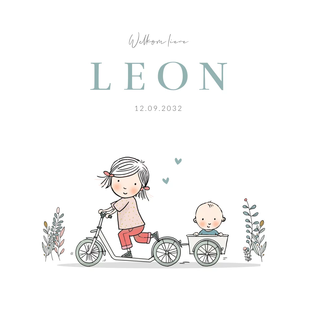 Geboortekaartje jongen step met aanhanger zusje. Teksten zijn naar wens aanpasbaar.