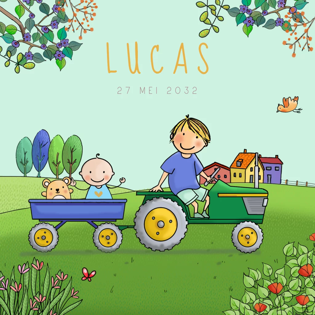 Geboortekaartje jongen tractor groen met blauwe aanhangwagen met grote broer