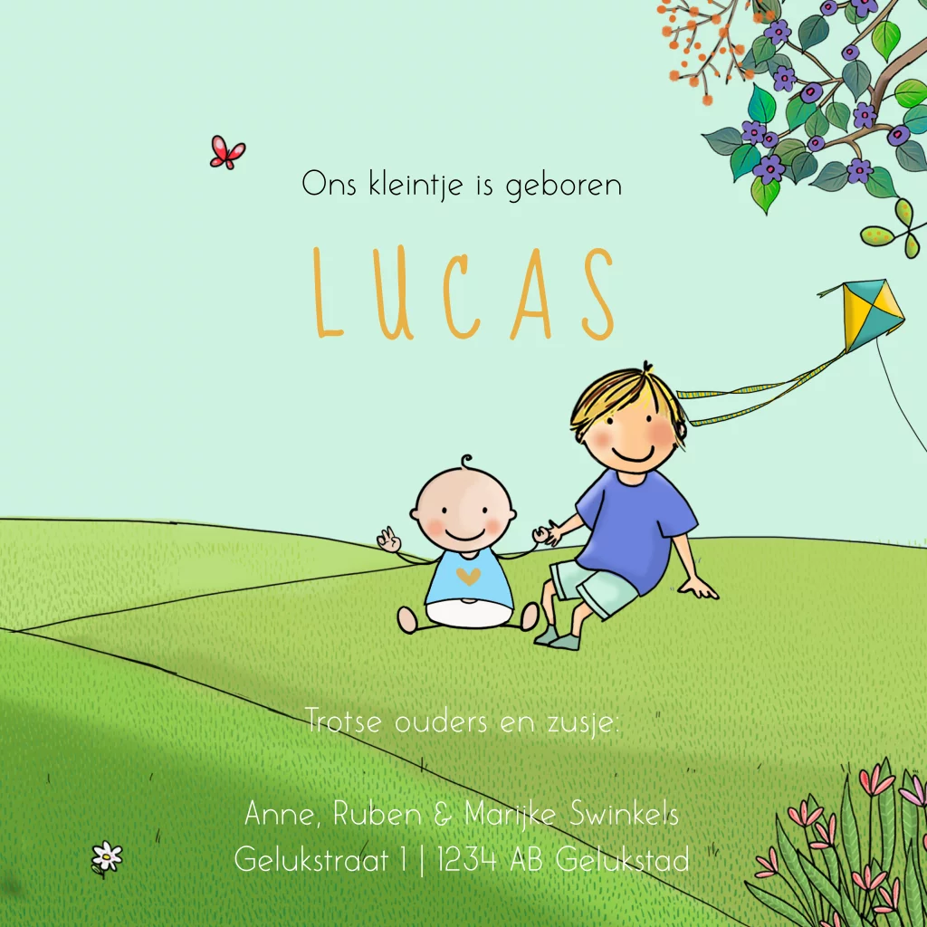 Geboortekaartje jongen tractor groen blauwe aanhangwagen broertjes