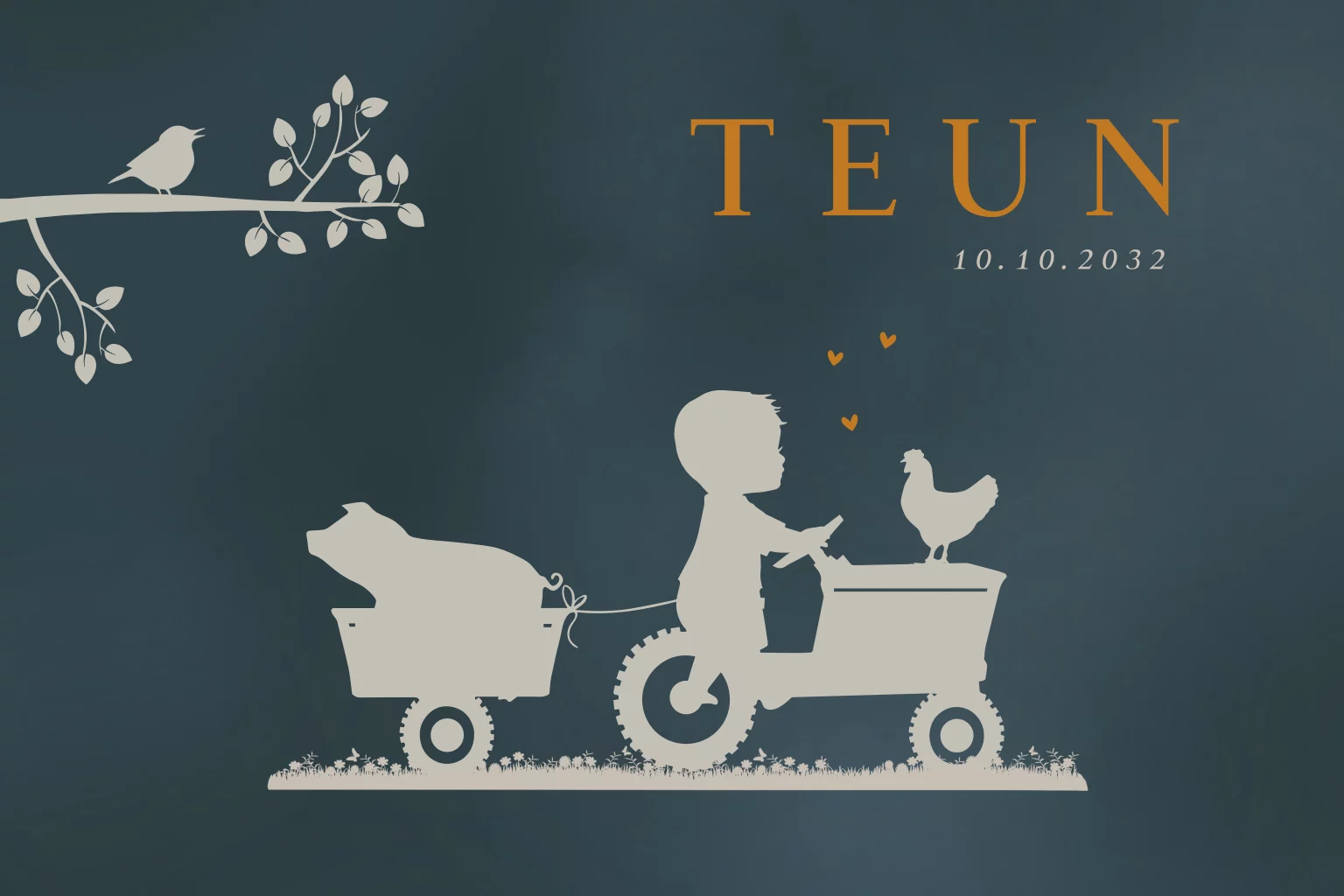 Geboortekaartje jongen tractor met aanhanger, daarin zit een varkentje, de kip staat bovenop de tractor. Tak met vogel maken het mooi af. Je kunt uit de clipart ook kiezen uit andere boerderijdieren.