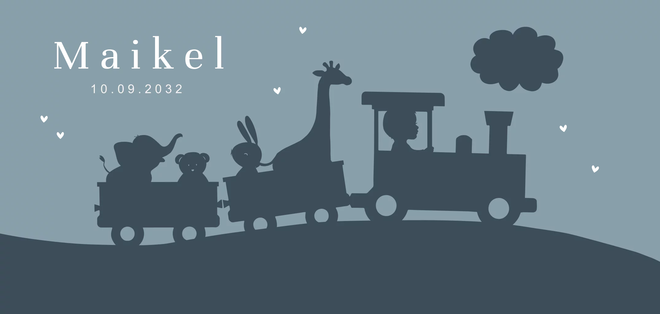 Een super lief geboortekaartje van een jongen in een treintje met dieren, giraf, konijn, beertje en olifant. Goudkleurige hartjes en tekst maakt het kaartje mooi rijk.
