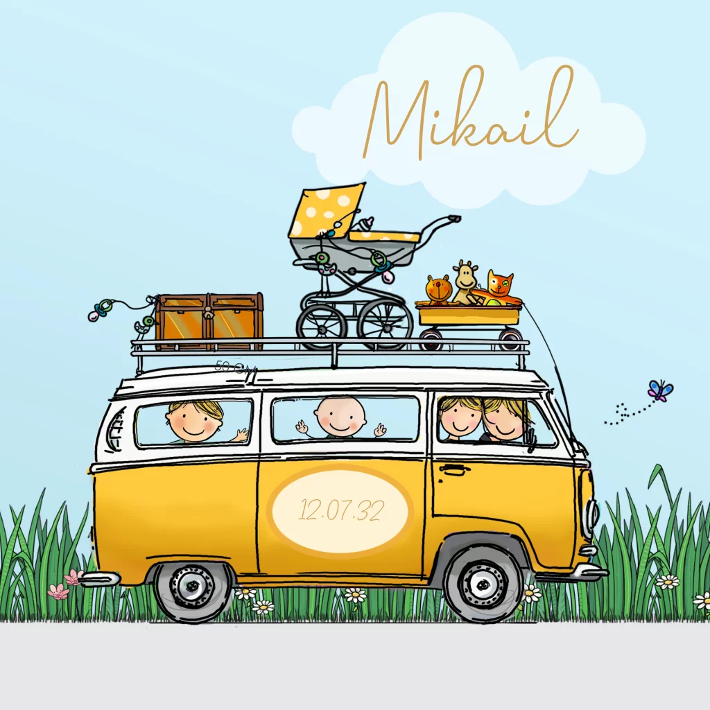 Geboortekaartje jongen volkswagen t2 geel met broertje. In de clipart staan vele leuke ouders die je kunt uitzoeken. Teksten zijn ook naar wens aanpasbaar.