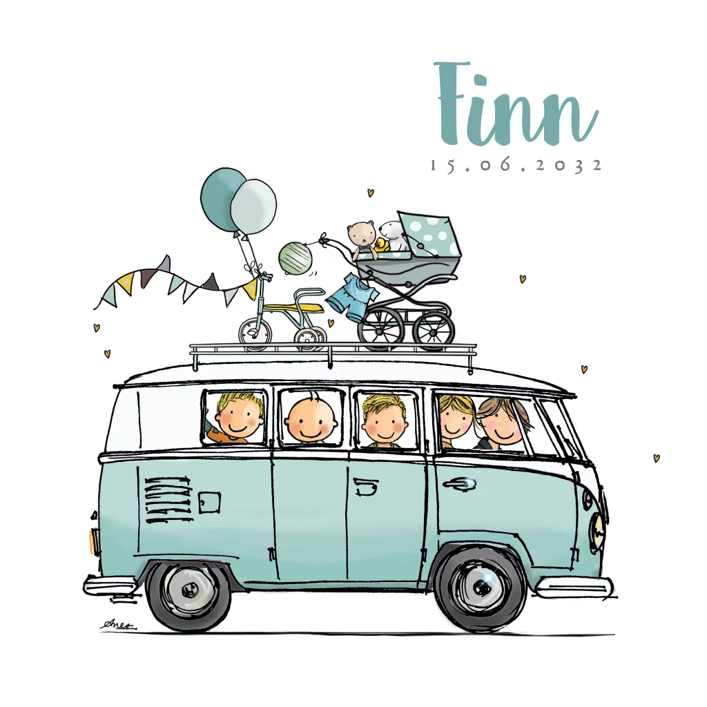 Geboortekaartje jongen vw bus blauwgroene ballonnen broertjes