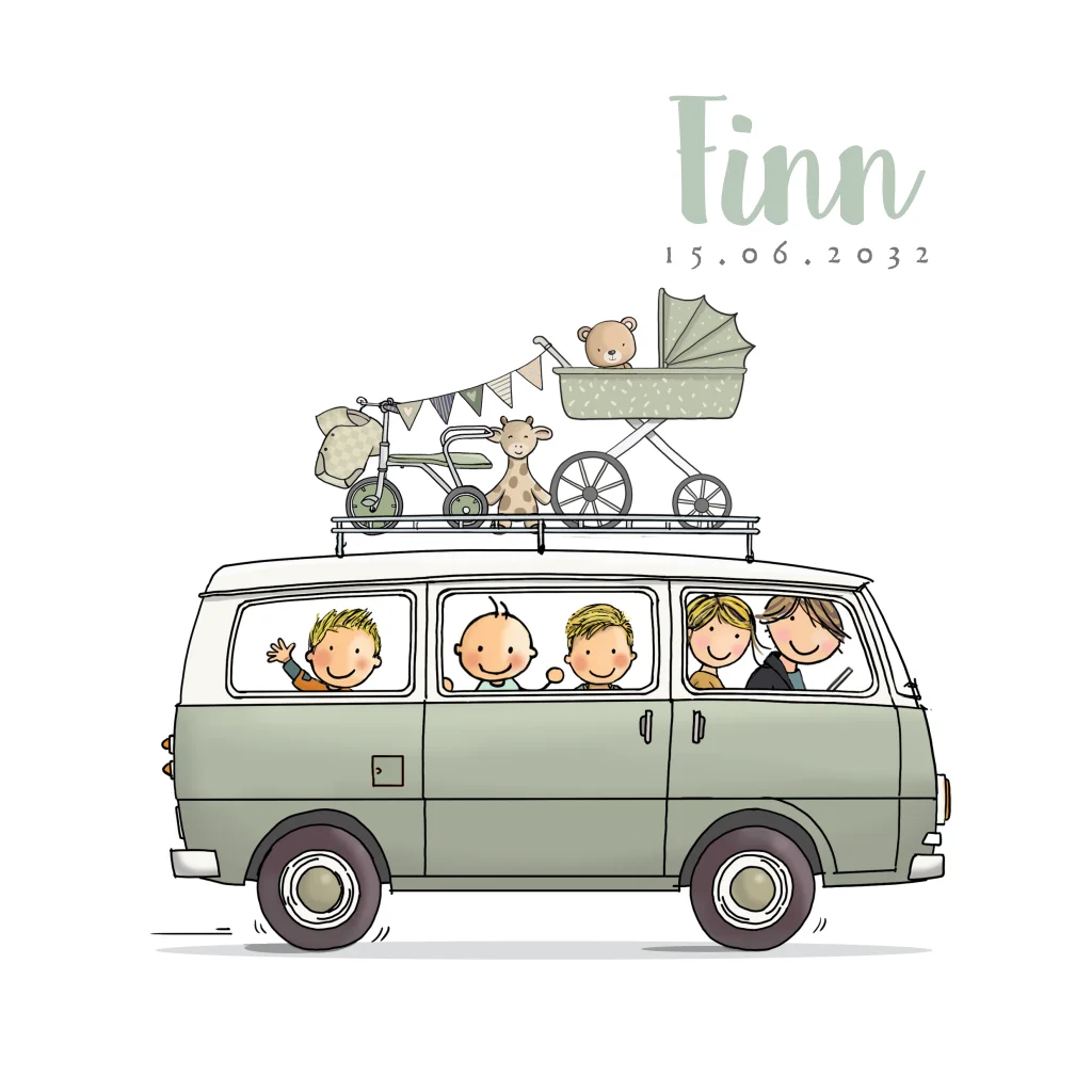 Origineel en bijzonder leuk en vrolijk geboortekaartje jongen met ouders in bus in roze kleur, kinderwagen, fietsje, vlaggetjes en ballonnen zijn op het dak van de bus, broertjes zitten erin.