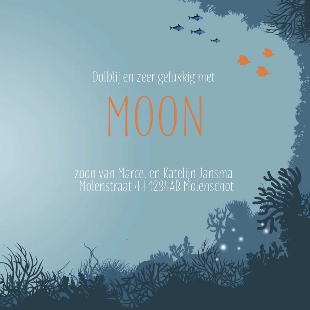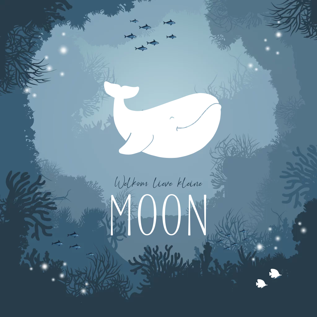 Welkom in de betoverende waterwereld van het geboortekaartje jongen waterworld sprookje. Dit prachtig getekende geboortekaartje neemt je mee op een reis door de onderwaterwereld, waar de vissen en walvis schitteren boven de diepe blauwe zee. De illustraties zijn liefdevol vormgegeven en bieden een luxe uitstraling aan dit unieke kaartje