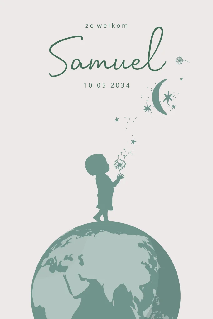 Welkom bij onze winkel voor unieke en bijzondere geboortekaartjes. Wij hebben een leuk en uniek ontwerp voor jongens: een wereldbol met sterren en maantjes. Dit kaartje is perfect voor pasgeborenen die de wereld willen verkennen!