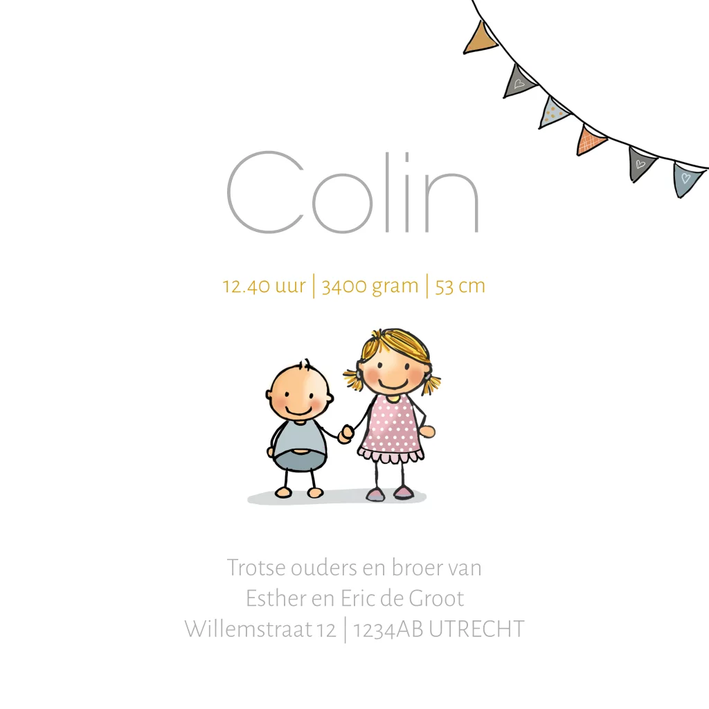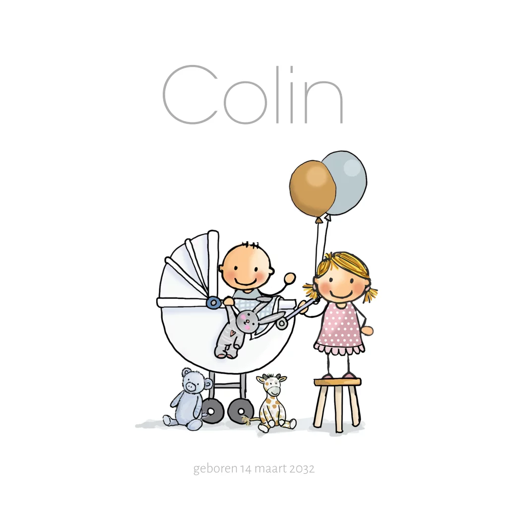 Geboortekaartje jongen wieg wit met zusje en vele leuke knuffels. Teksten zijn naar wens aanpasbaar.