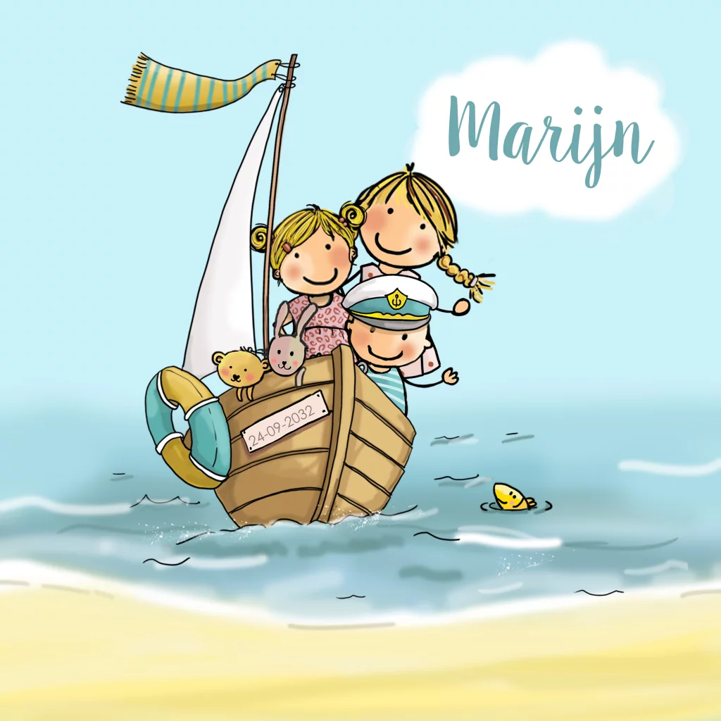 Geboortekaartje jongen in bootje met zusjes, mooi geïllustreerd kaartje van zee met boot en vissen. De afbeeldingen zijn los, uit de clipart kun je je kaart zelf samenstellen.
