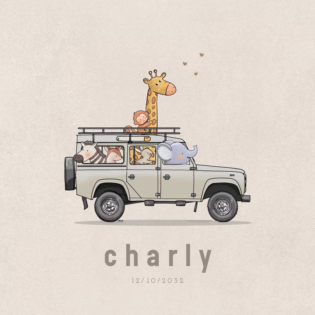 Geboortekaartje Landrover met dieren, olifant, giraf, muis, zebra, beer, konijn, aap en hertje. De achtergrond kleur is naar wens aanpasbaar. Mooie doorlopende binnenkant met dieren die in het busje zitten. Volkswagenbusjes zijn al lang een geliefd motief op geboortekaartjes. Dit busje met schattige dieren is een schitterend voorbeeld van een origineel en leuk geboortekaartje. Het design is uniek en de kleur oranje maakt het busje echt opvallen. Het geboortekaartje is ook voorzien van een koperfolie accent, wat het geheel een luxe uitstraling geeft.