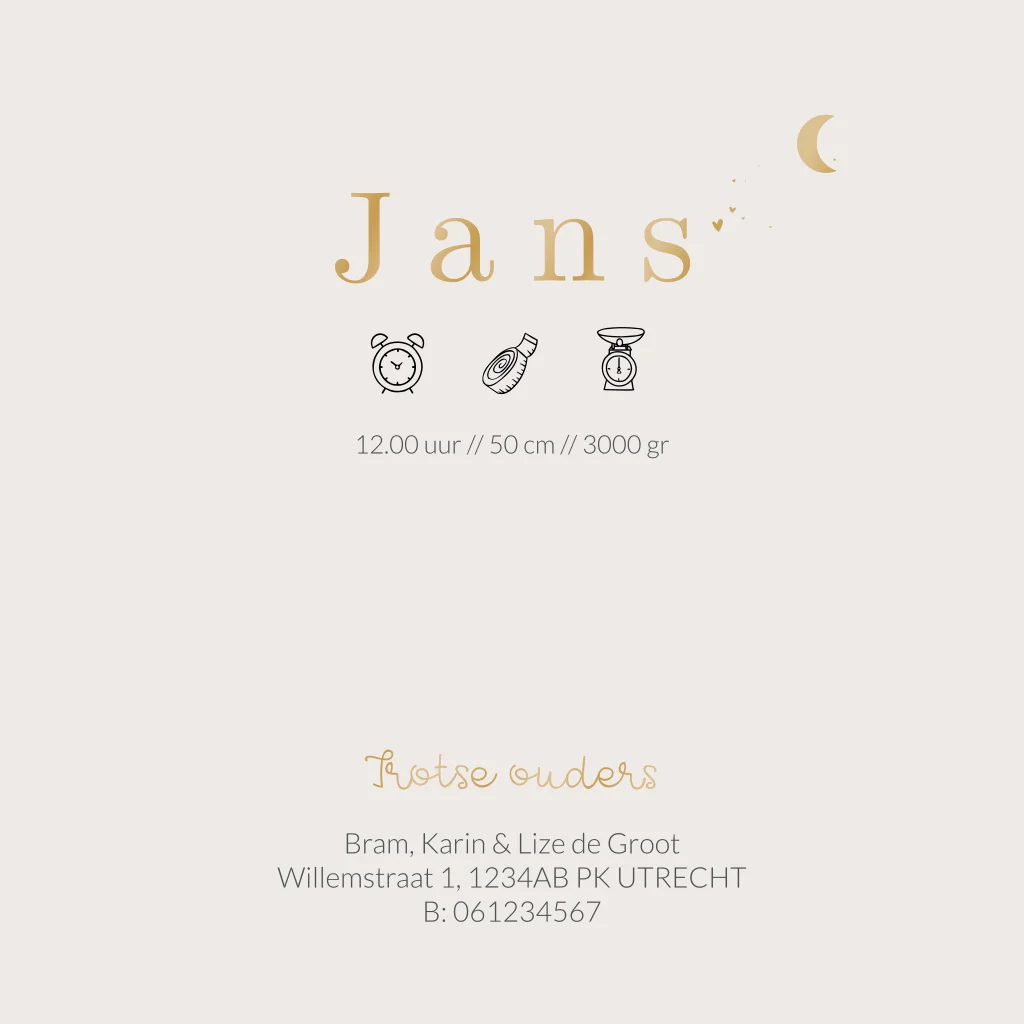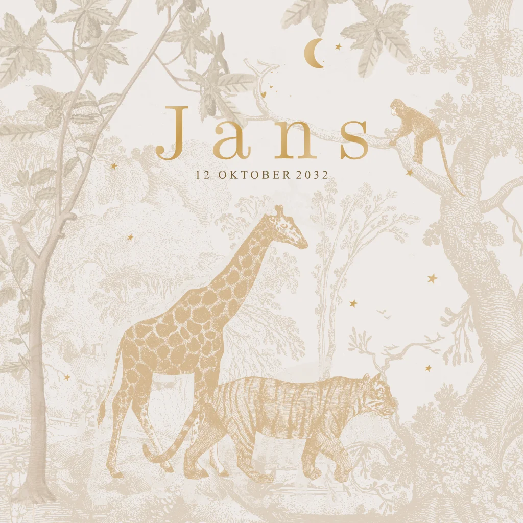 Geboortekaartje pentekening landschap in zachte tinten met op de voorgrond giraf en tijger en aapje. Mooie folie sterren en naam maakt het kaartje heelmaal af.