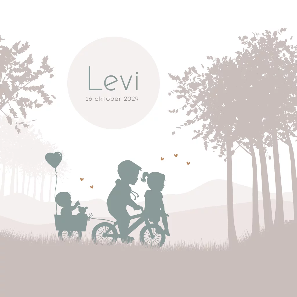Geboortekaartje landschap jongen met broertje en zusje op fiets